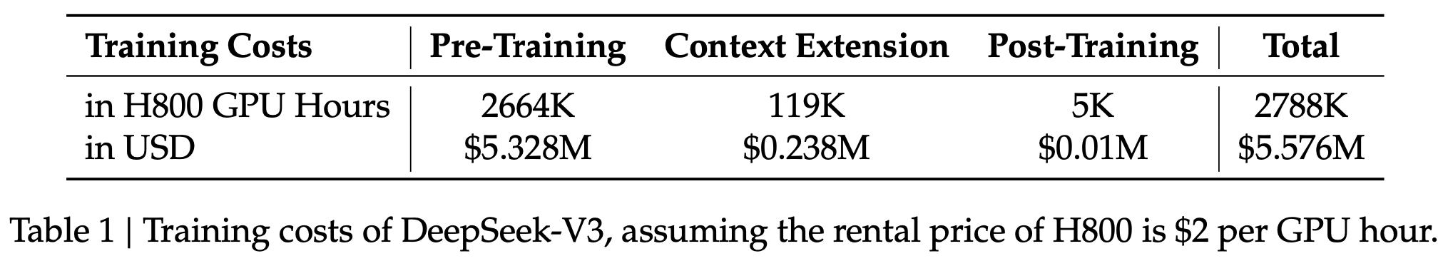 Lastly, we emphasize again the economical training costs of DeepSeek-V3, summarized in Table 1, achieved through our optimized co-design of algorithms, frameworks, and hardware. During the pre-training stage, training DeepSeek-V3 on each trillion tokens requires only 180K H800 GPU hours, i.e., 3.7 days on our cluster with 2048 H800 GPUs. Consequently, our pre- training stage is completed in less than two months and costs 2664K GPU hours. Combined with 119K GPU hours for the context length extension and 5K GPU hours for post-training, DeepSeek-V3 costs only 2.788M GPU hours for its full training. Assuming the rental price of the H800 GPU is $2 per GPU hour, our total training costs amount to only $5.576M. Note that the aforementioned costs include only the official training of DeepSeek-V3, excluding the costs associated with prior research and ablation experiments on architectures, algorithms, or data.