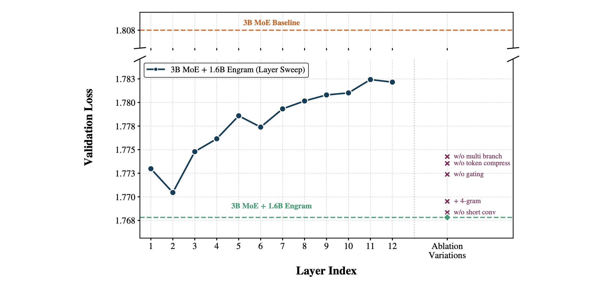 - (1) 层敏感度(深蓝色曲线):通过对单个 Engram 模块插入深度的扫描,确认了早期注入(第 2 层)效果最优,而随着层数加深,其效能逐渐下降。