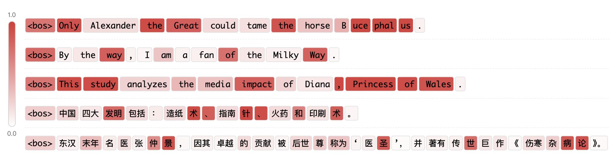 热图的深浅程度对应于门控标量 $\alpha_t \in [0, 1]$ 的大小,其中深红色表示更强的激活度。由于 Engram 作用于后缀 N-gram(此处 N=3),特定 token $x_t$ 上的高激活度意味着:以该 token 结尾的前序 token 序列(例如,在 $t$ 处结束的短语)被识别为一种能够从内存中有效检索的静态模式(static pattern)。