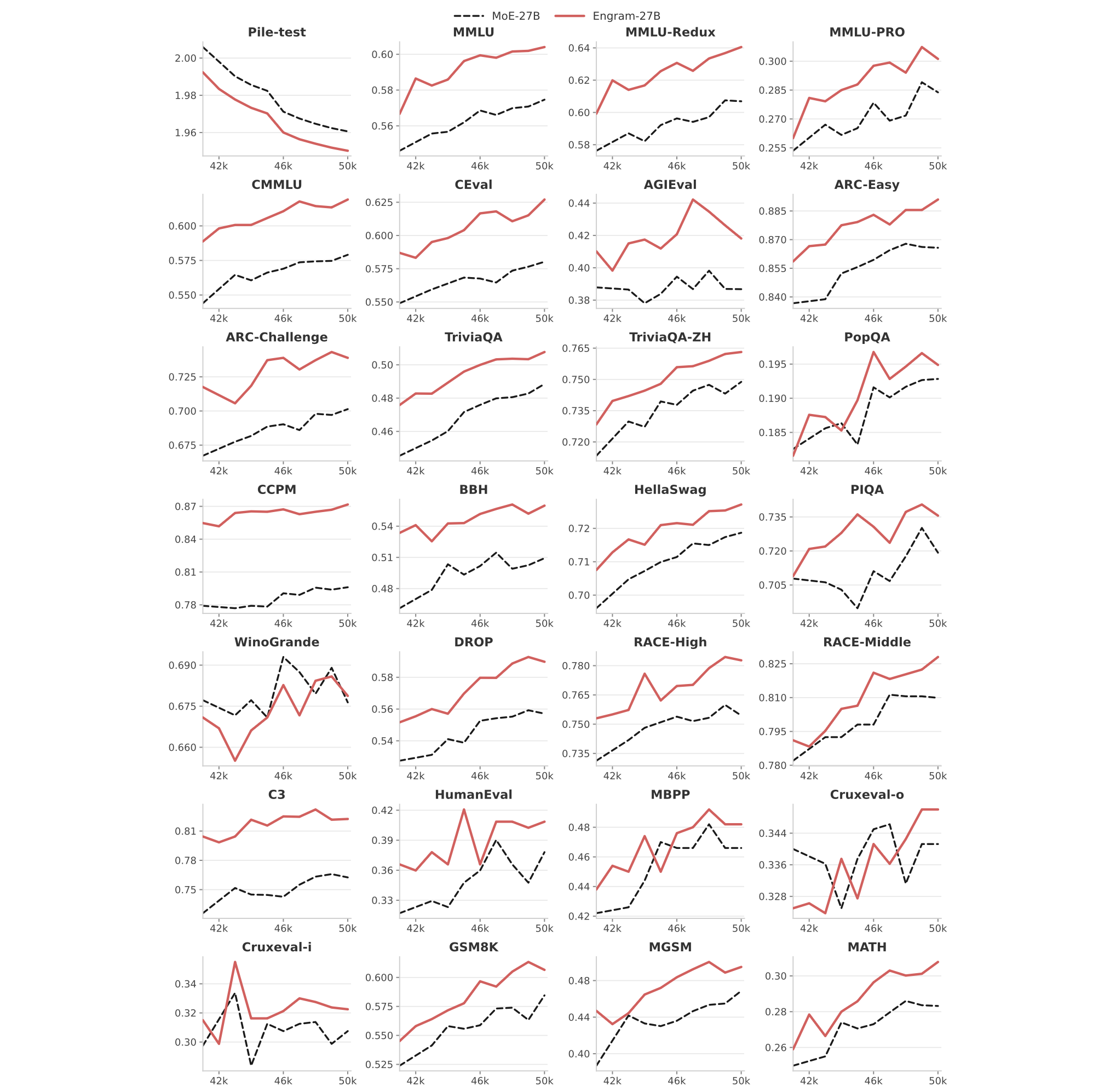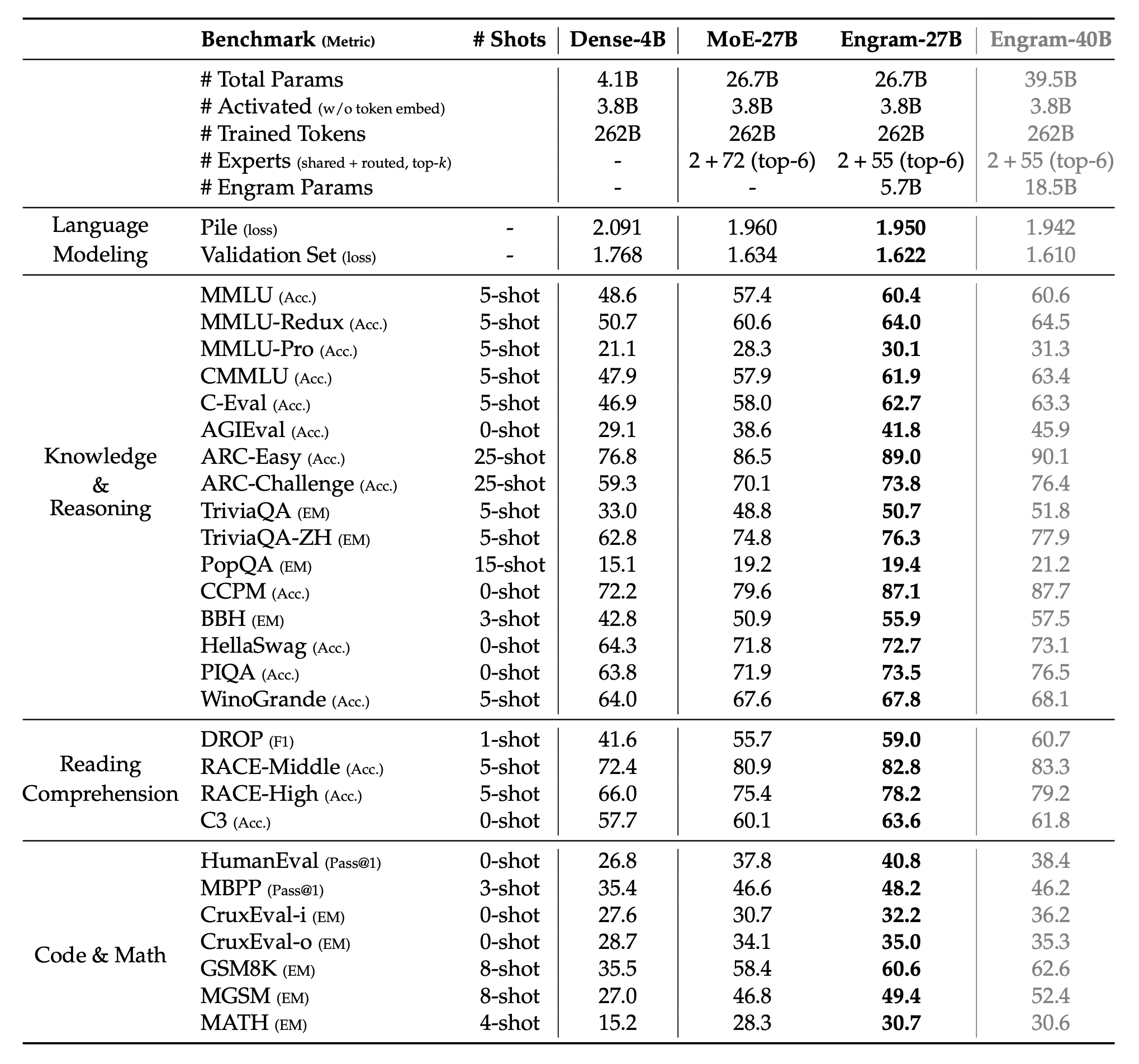 所有模型均经过 262B(2620 亿)token 的训练,且激活参数量(3.8B)保持一致。Engram-27B 通过将路由专家(routed experts)的参数进行重新分配(数量从 72 个减少到 55 个)并转入一个 5.7B 参数的 Engram 内存模块,从而实现了与 MoE-27B 的等参数量对标。Engram-40B 则在保持激活参数预算不变的情况下,进一步增加了 Engram 内存(达到 18.5B 参数)。