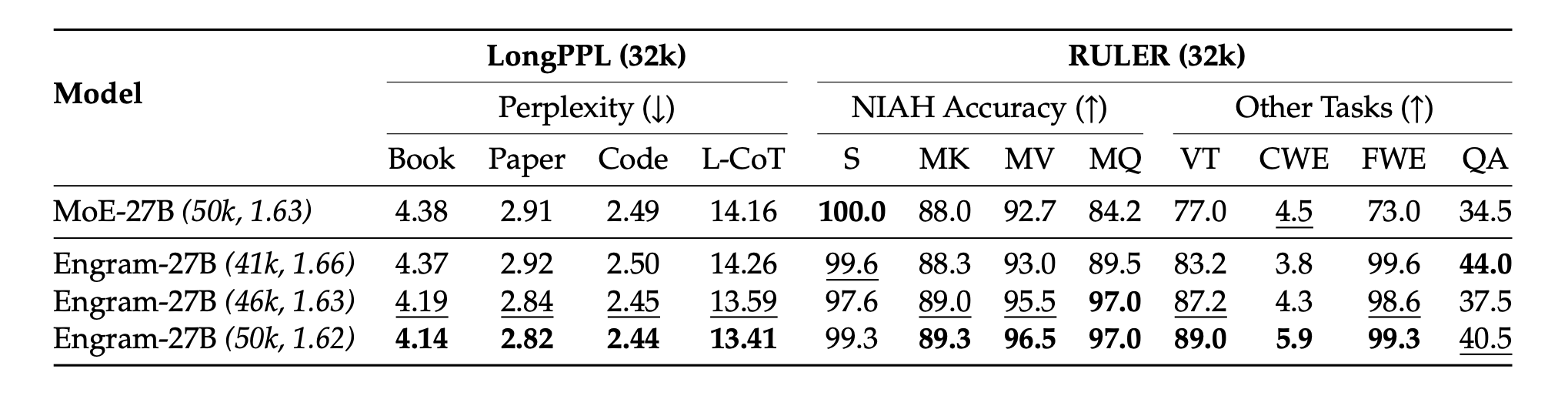 括号中的数值(如 (50k, 1.62))表示预训练步数及长文本扩展前对应的损失值。两个关键发现:(1) 仅需 82% 的预训练计算量(FLOPs,即 41k 对比 50k 步),Engram-27B 即可达到基准模型的 LongPPL 性能,同时在 RULER 基准测试中获得显著更高的准确率;(2) 在等预训练损失(46k 步)和等预训练计算量(50k 步)的设定下,Engram-27B 在所有指标上均大幅超越基准模型。加粗表示最优,下划线表示次优。