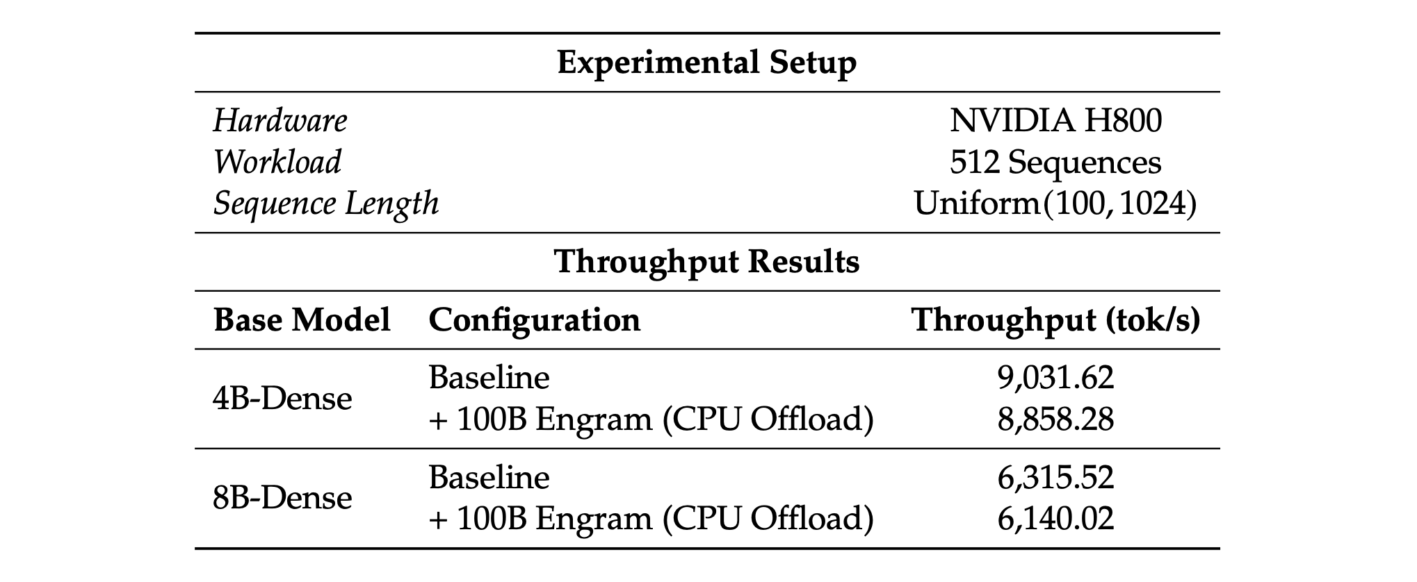 测量了在将一个 100B 参数的 Engram 层完全卸载(offload)到主机内存(host memory)情况下的推理吞吐量。