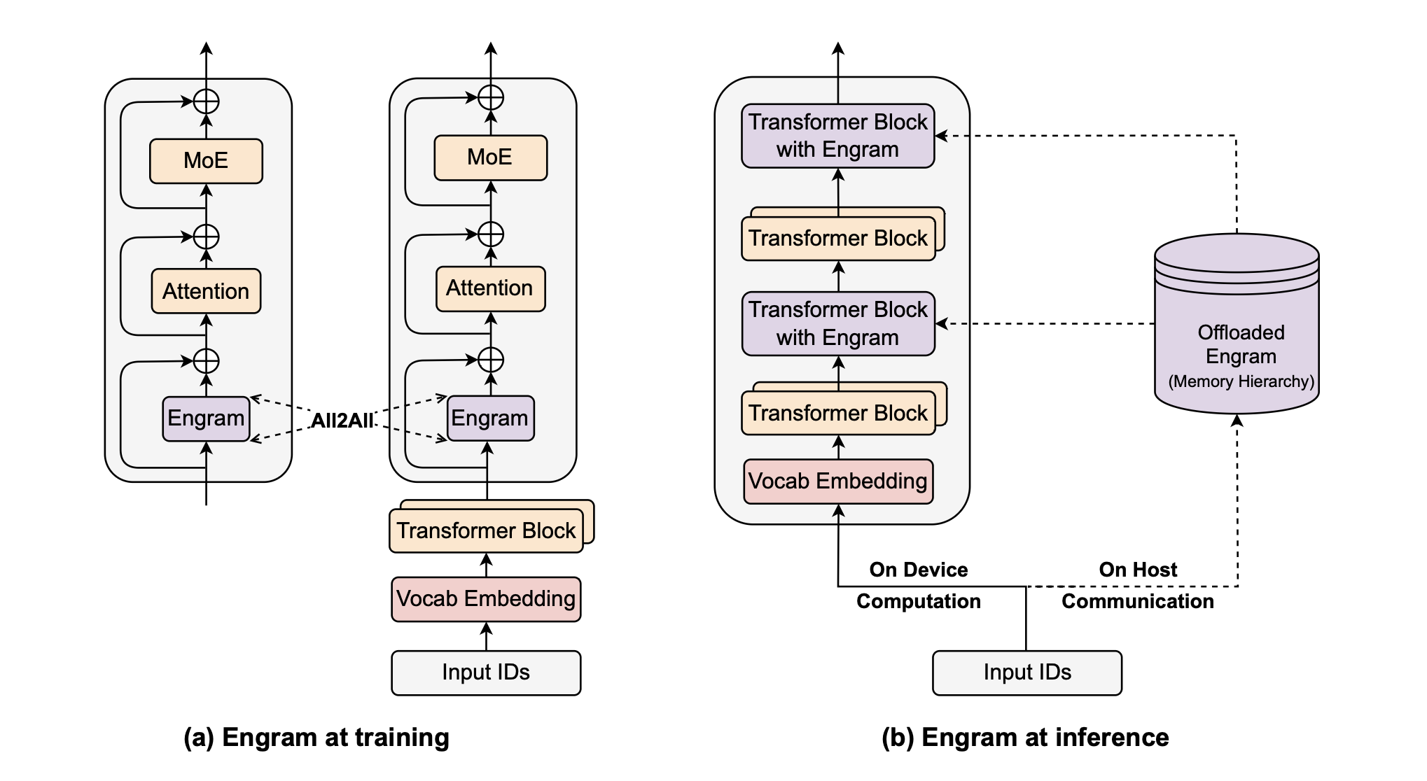 N-gram的访问频率符合齐夫定律(极少数模式占据绝大多数访问),Engram 支持多级缓存层次结构(Multi-Level Cache Hierarchy)。高频模式缓存在 GPU HBM 或主机内存中,长尾稀疏模式则可存放于 SSD,从而以极低延迟支持海量参数扩张。 - 异步预取 (Prefetching):与 MoE 的动态路由不同,Engram 的索引仅取决于
