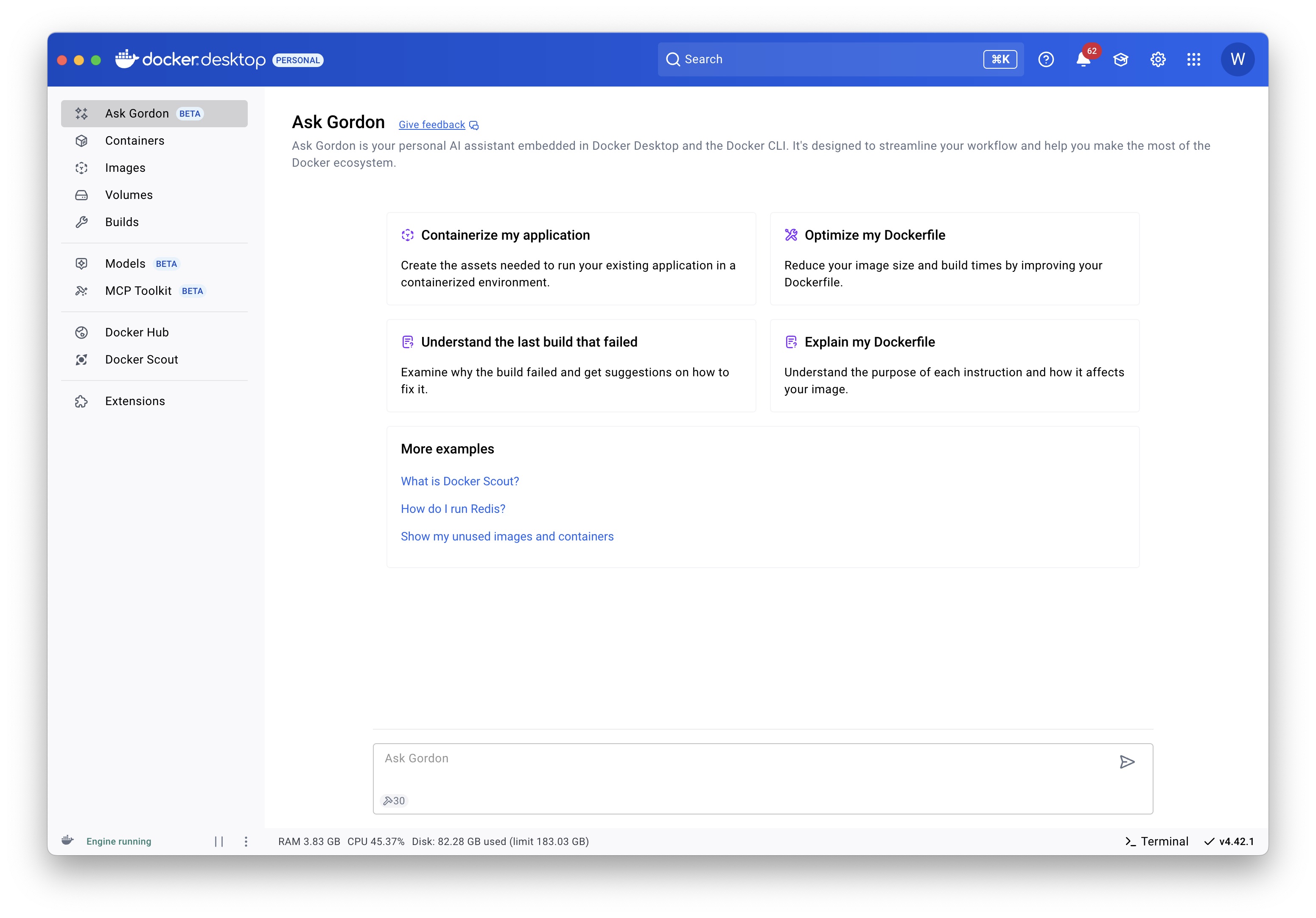 Ask Gordon 是一个通用 AI 助手,旨在帮助您完成所有与 Docker 相关的任务和工作流程。如果您需要一些灵感,以下是您可以尝试的几种方法: