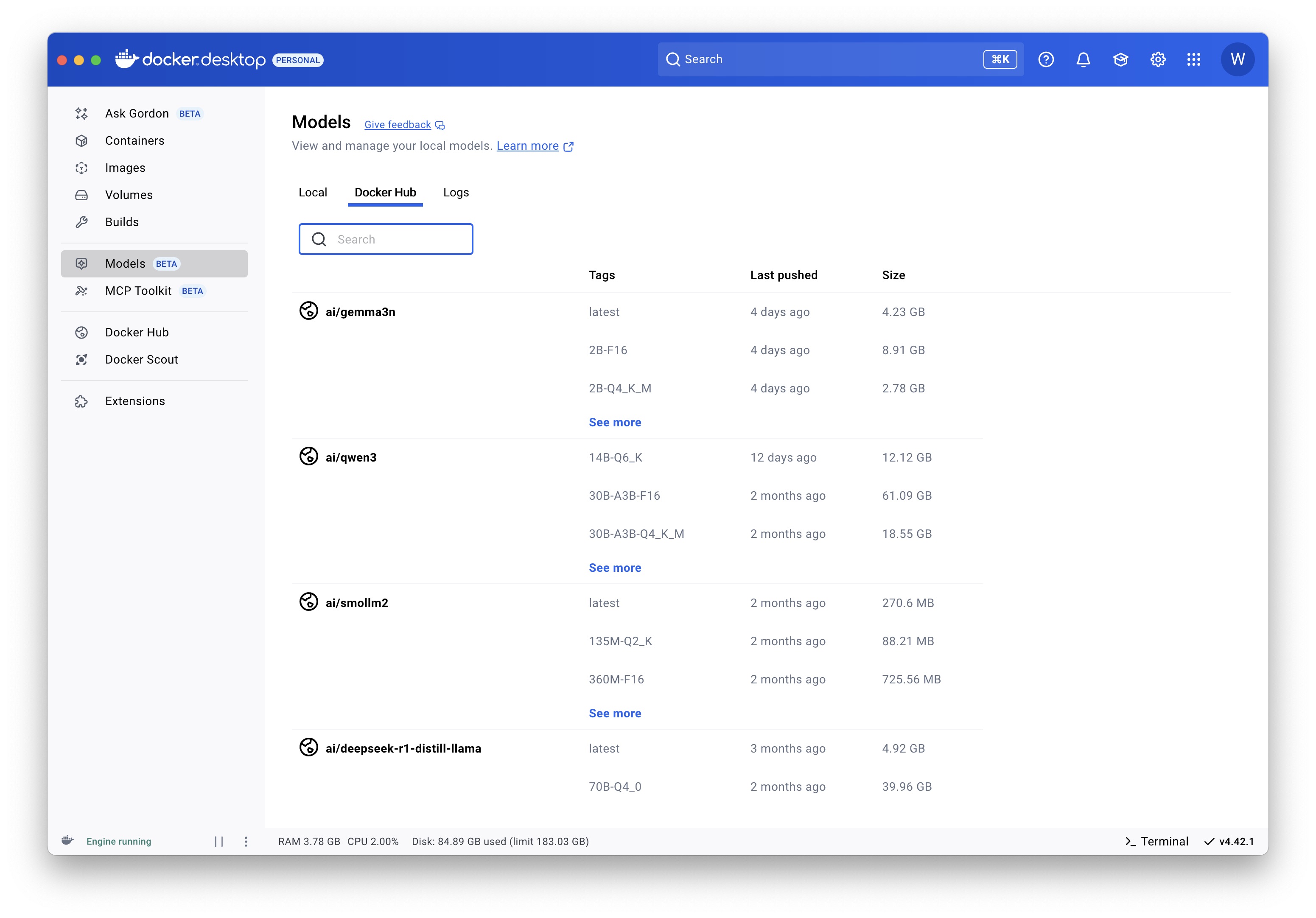 所有可用模型都托管在 ai 的公共 Docker Hub 命名空间。