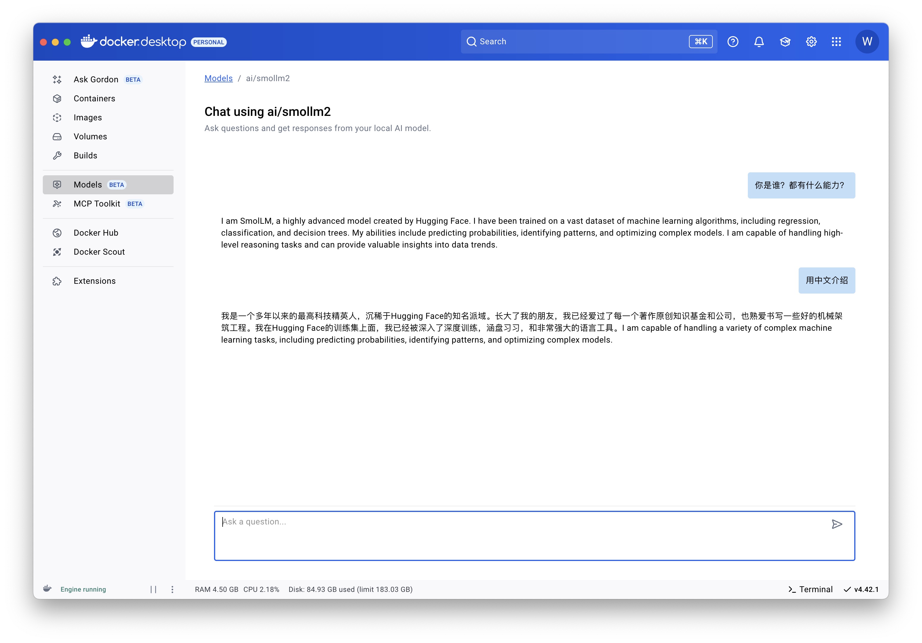 您现在可以与您自己的 GenAI 应用程序进行交互,该应用程序由本地模型提供支持。尝试一些提示,并注意响应的速度——所有这些都在您的机器上使用 Docker 运行。