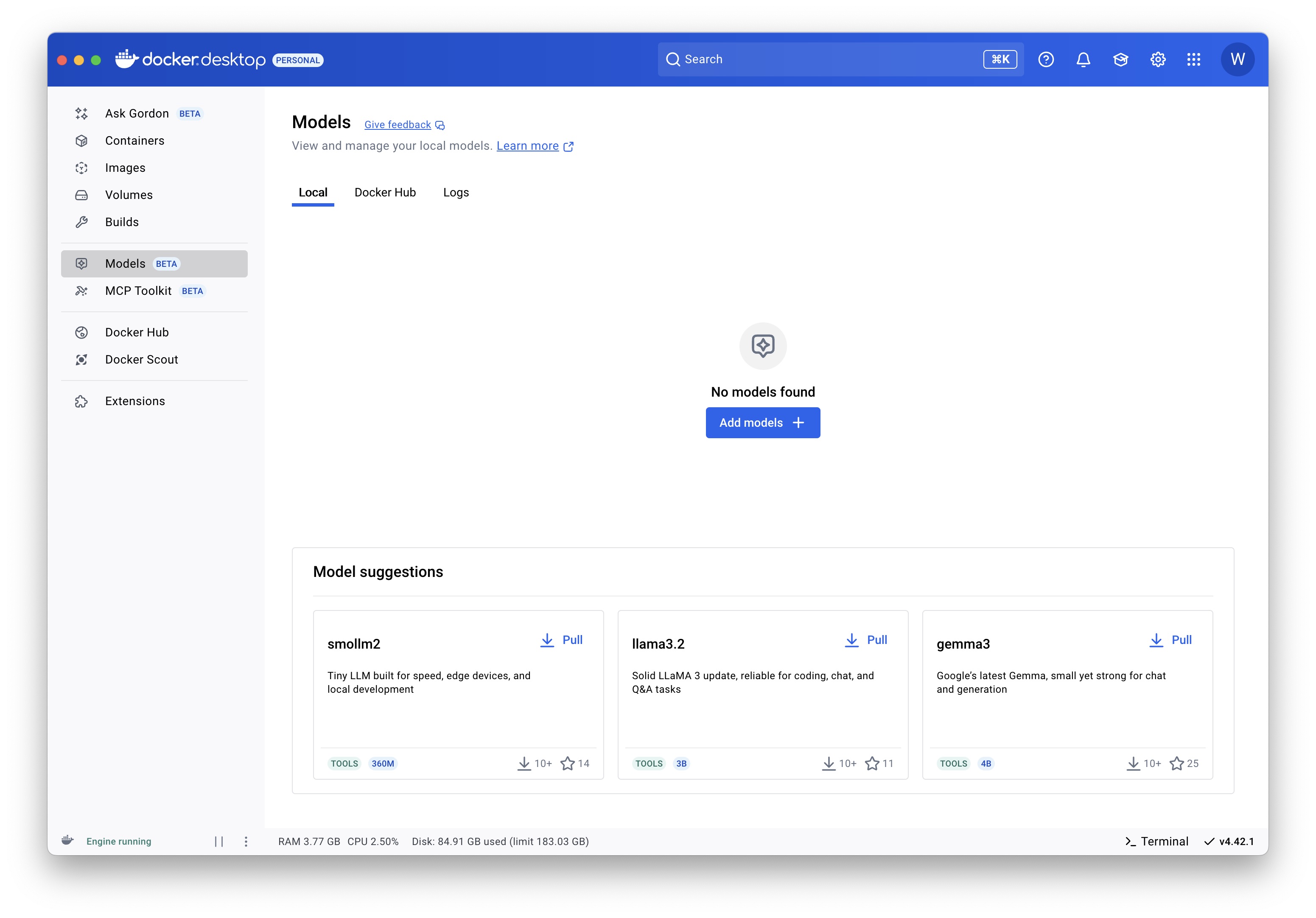 模型首次使用时会从 Docker Hub 拉取并存储在本地。它们只在运行时收到请求时才加载到内存中,并在不使用时卸载以优化资源。由于模型可能很大,首次拉取可能需要一些时间,但之后它们会缓存在本地以实现更快的访问。您可以使用兼容 OpenAI API与模型进行交互。