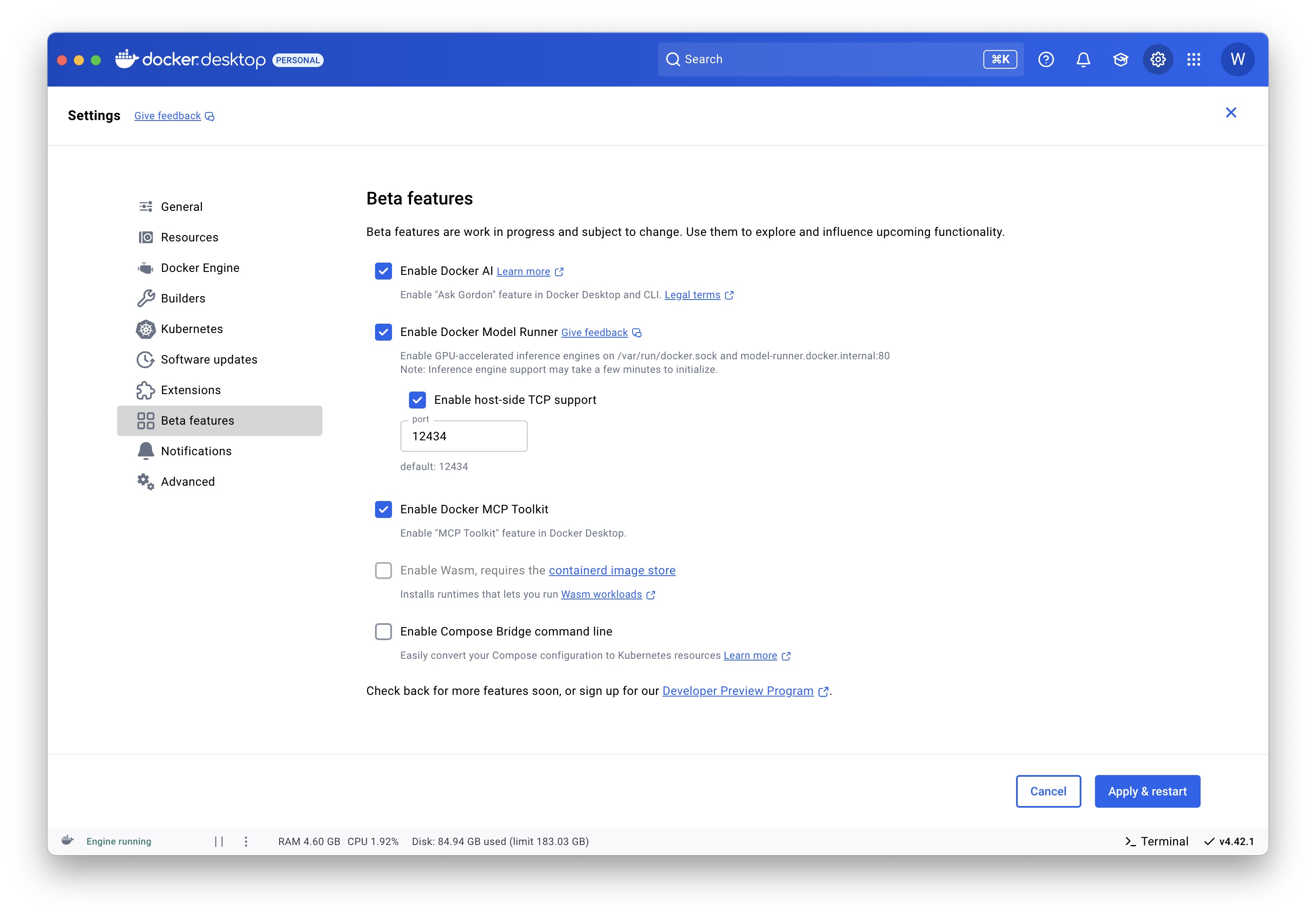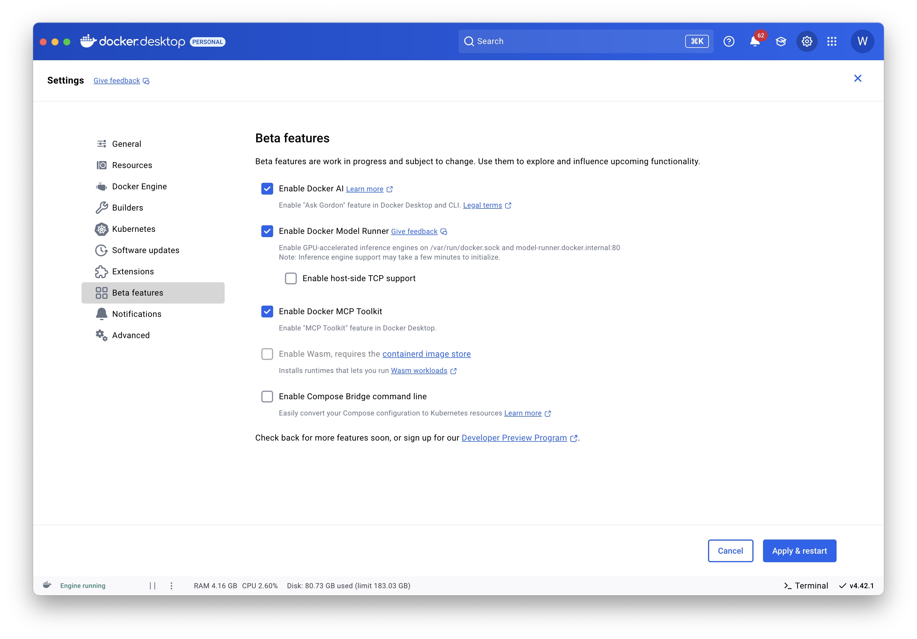这些功能默认情况下未启用,并且尚未准备用于生产环境。您可能还会遇到术语”Docker AI”作为对此技术的更广泛引用。
