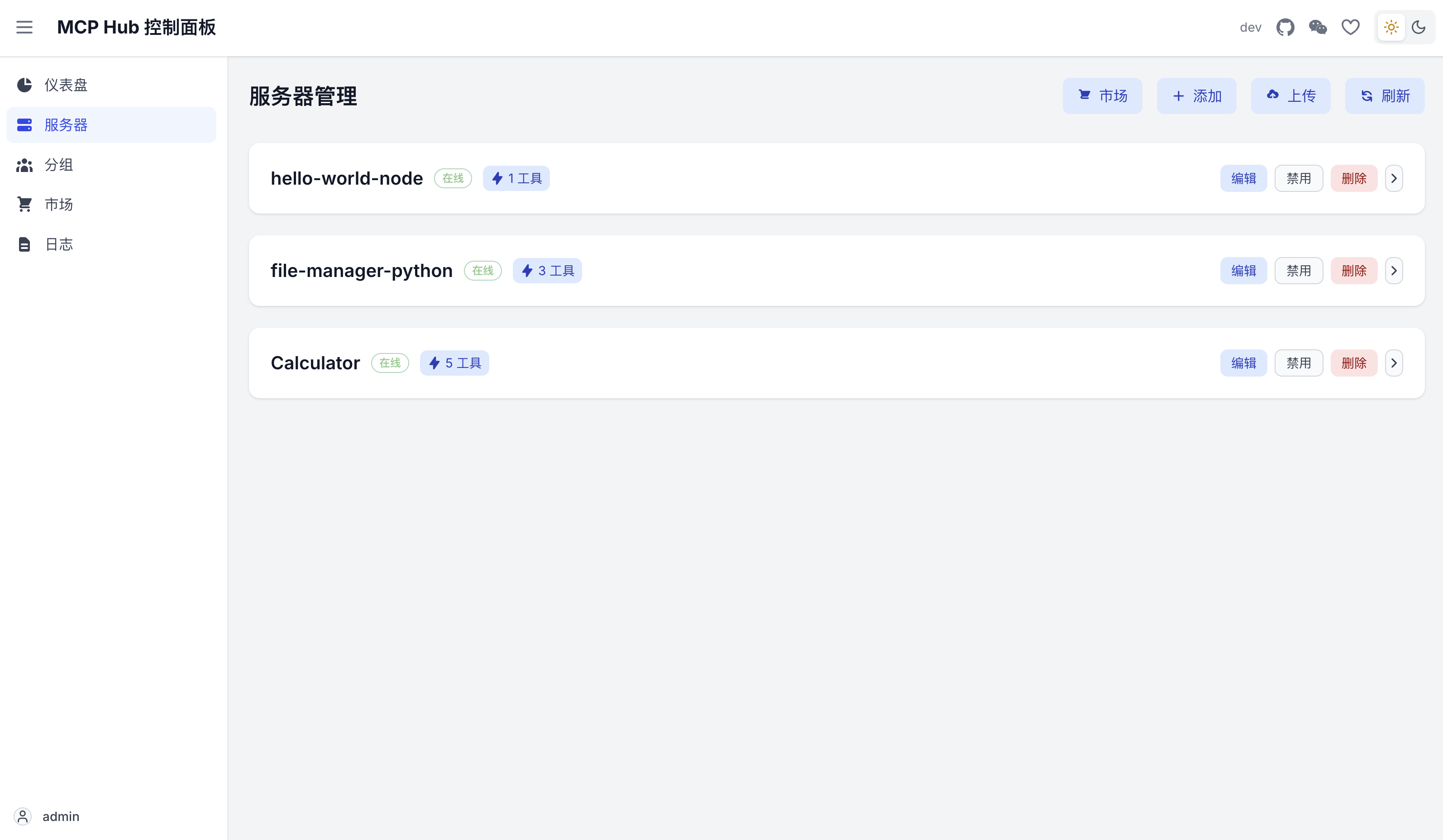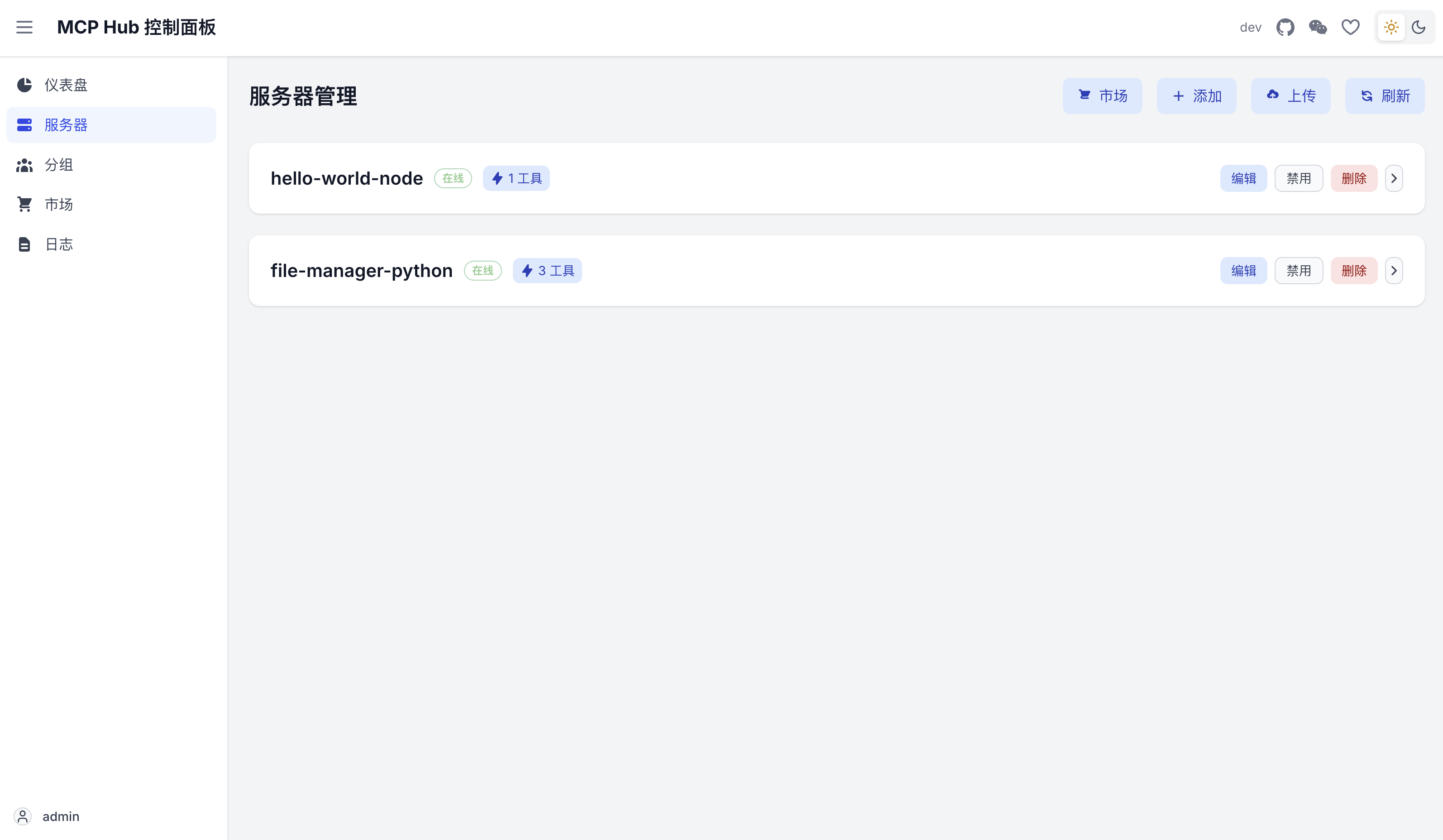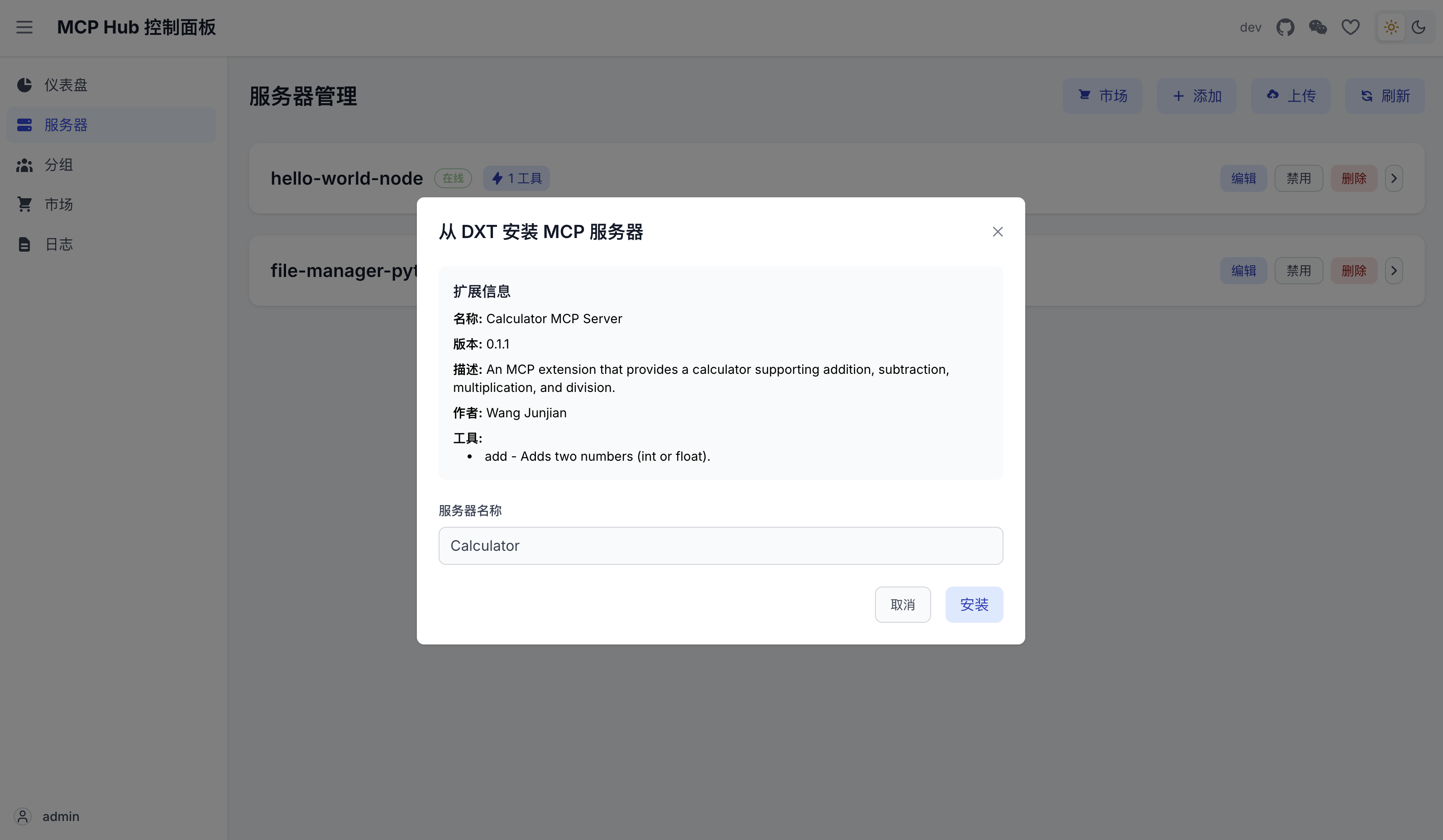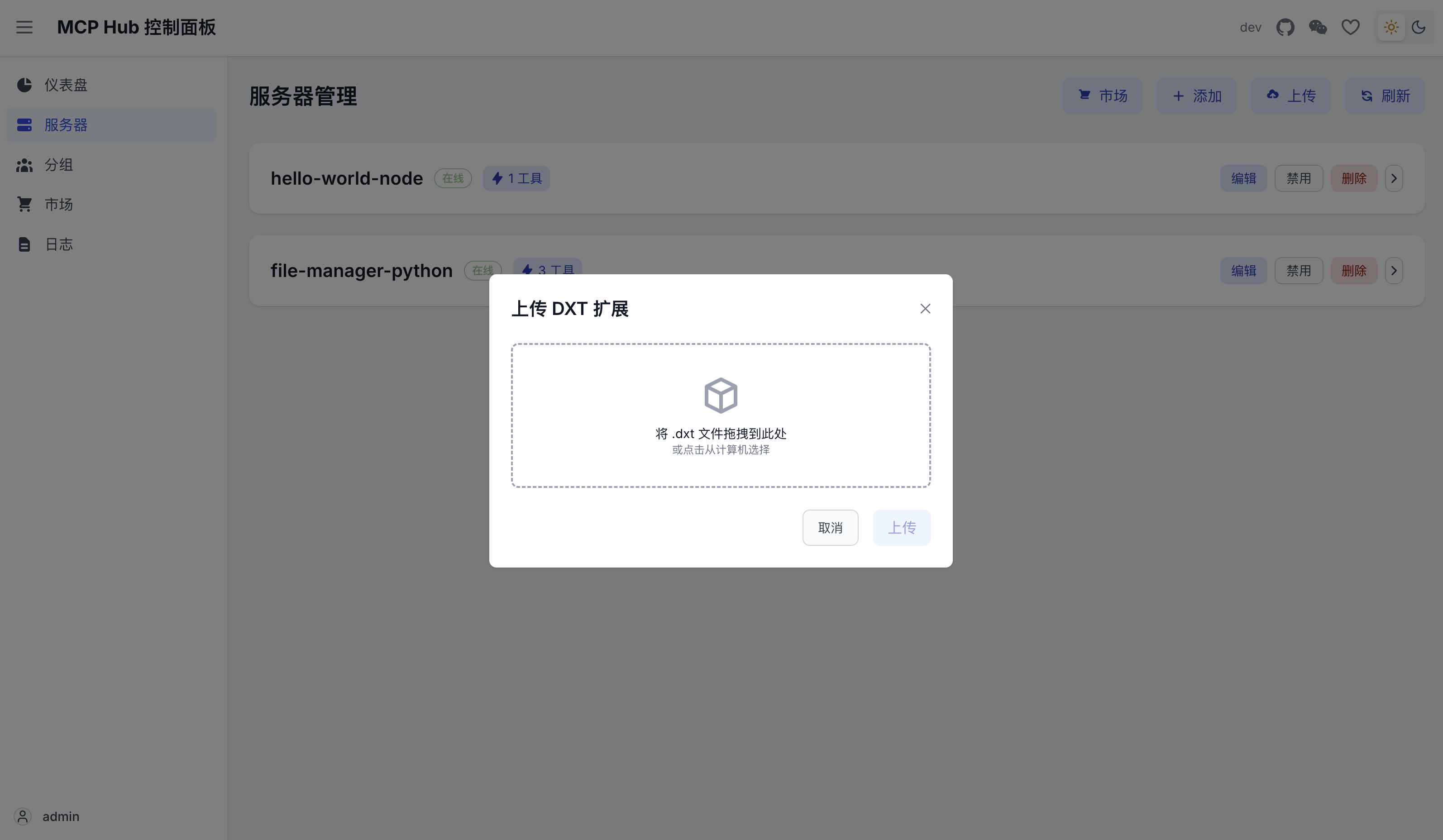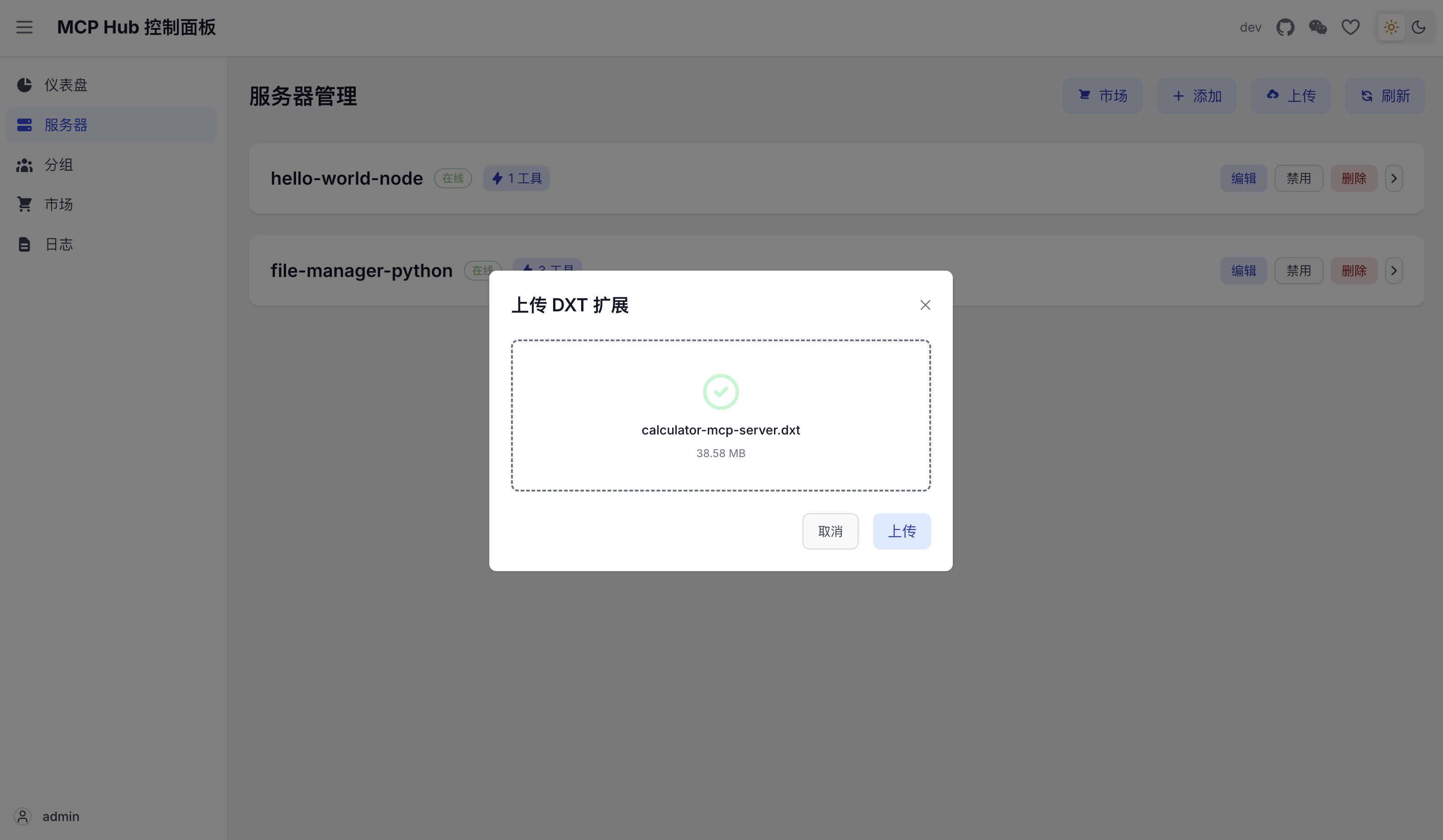 最后,在主机打包 DXT 扩展并上传到 MCPHub(容器),成功运行 MCP 服务器。