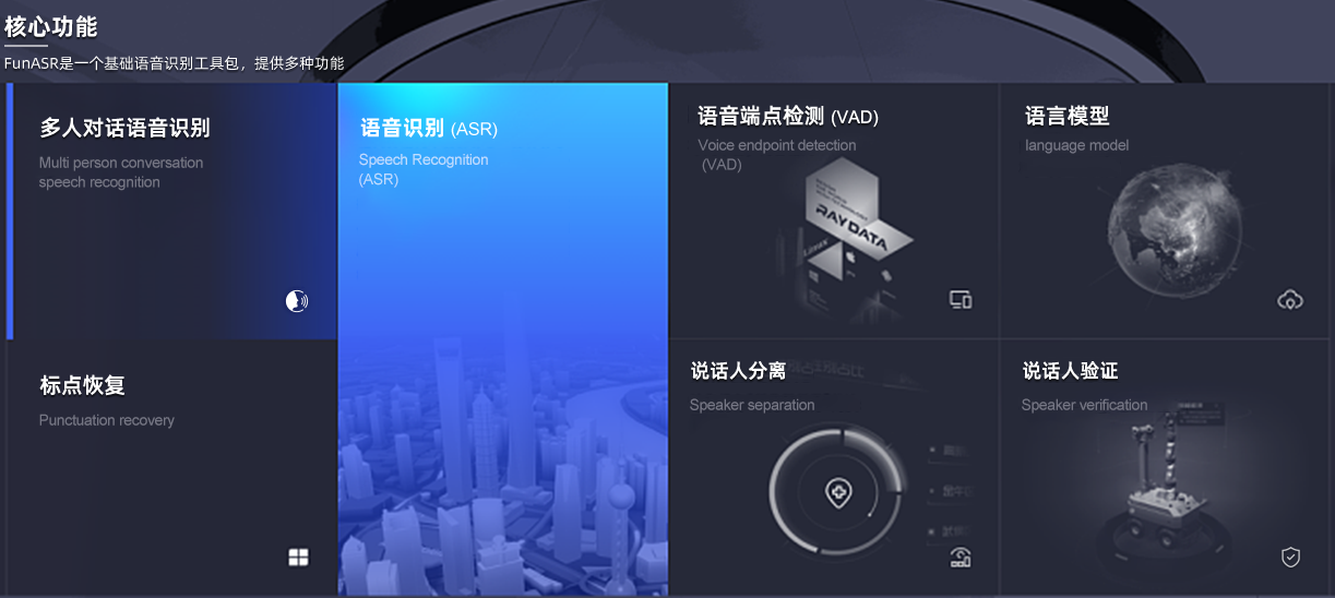 FunASR 是一个基础语音识别工具包,提供多种功能,包括语音识别(ASR)、语音端点检测(VAD)、标点恢复、语言模型、说话人验证、说话人分离和多人对话语音识别等。