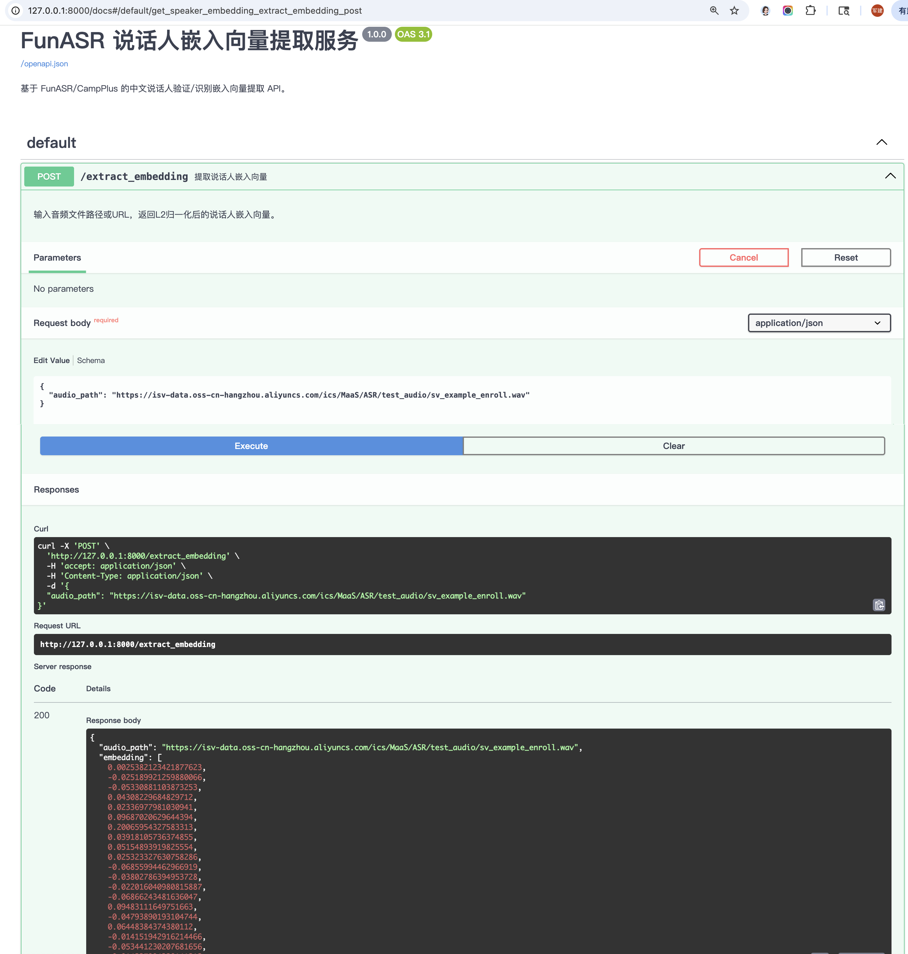 接受一个音频路径,调用模型提取说话人嵌入向量,并返回结果。