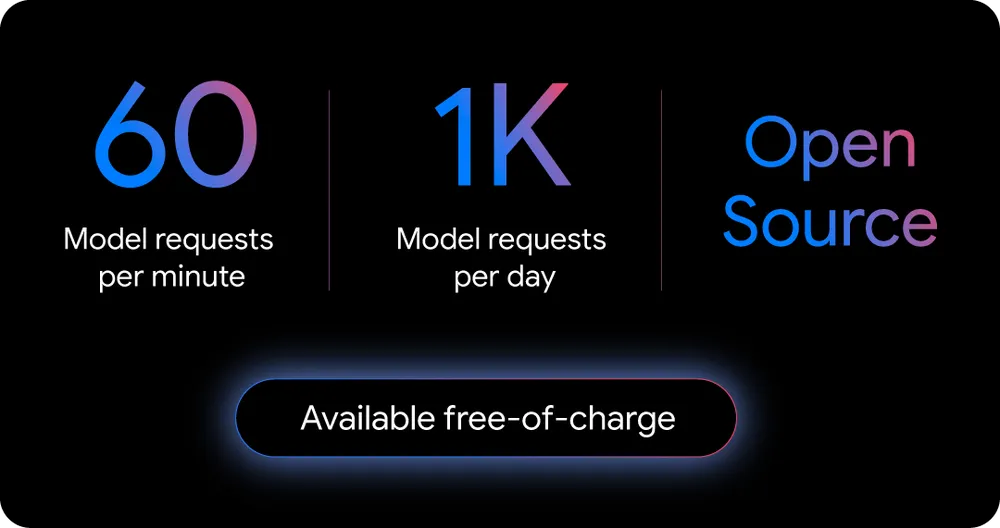 Gemini CLI 提供业界最高的免费使用限额,每分钟可发送 60 个模型请求,每天最多 1,000 个模型请求。