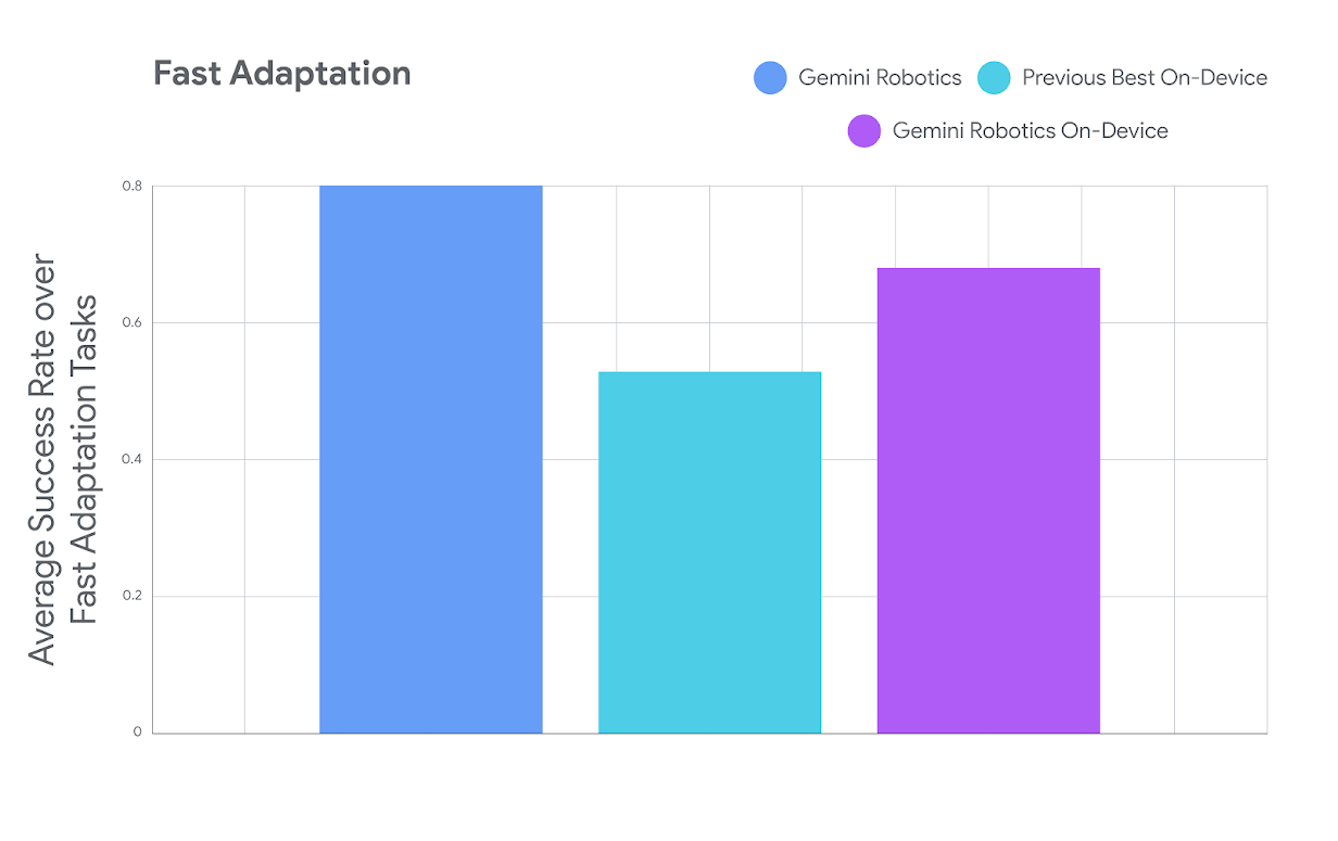 与现有方法的比较: 在快速适应方面,Gemini Robotics On-Device 在七项不同难度的灵巧操作任务中,“优于当前最佳的设备端 VLA”,且每个任务使用的示例不到 100 个。