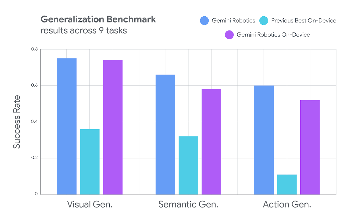 在视觉、语义和动作泛化方面,Gemini Robotics On-Device 的成功率显著高于“Previous Best On-Device”模型,并且接近或与“Gemini Robotics”模型持平。