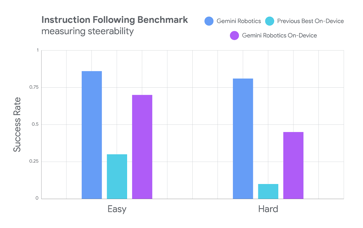 在“Easy”和“Hard”任务中,该模型在可控性方面的成功率远超“Previous Best On-Device”模型,再次接近“Gemini Robotics”模型。
