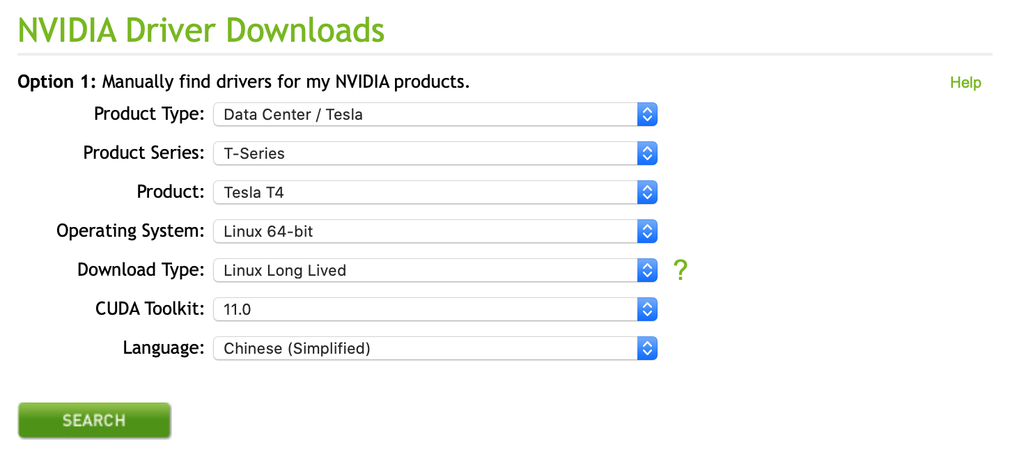 $ lspci | grep -i nvidia 0000:43:00.0 3D controller: NVIDIA Corporation TU104GL [Tesla T4] (rev a1) 0000:47:00.0 3D controller: NVIDIA Corporation TU104GL [Tesla T4] (rev a1) 0000:8e:00.0 3D controller: NVIDIA Corporation TU104GL [Tesla T4] (rev a1) 0000:92:00.0 3D controller: NVIDIA Corporation TU104GL [Tesla T4] (rev a1) - 到NVIDIA 驱动程序下载页面下载对应型号的驱动