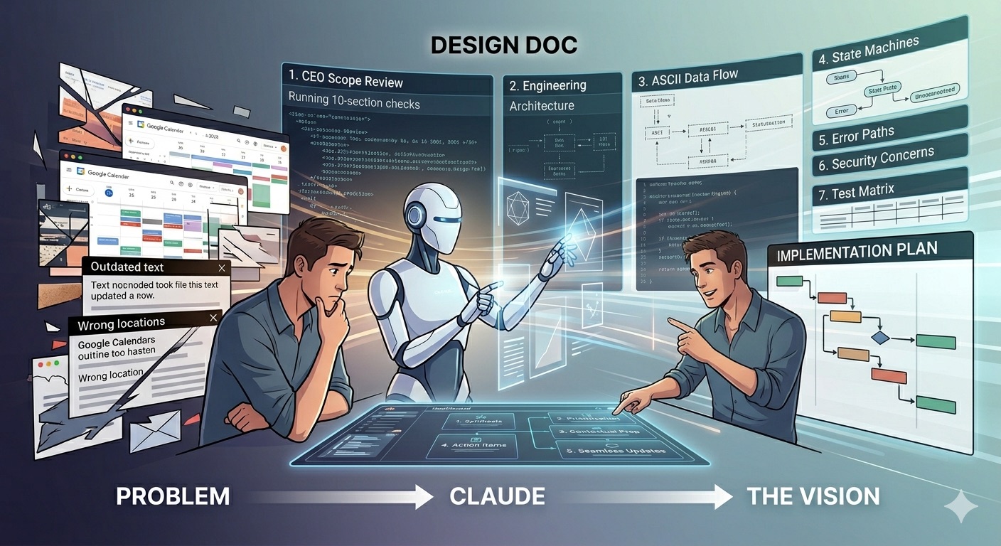 图 2:严谨的战略与设计评审。Claude(现为“幕僚长”,保持图 1 中的形象)在规划桌前指挥。图 1 中的核心模块被展开成详细的“设计文档”。我们能看到 CEO 维度的范围审查,以及包含 ASCII 数据流、状态机和安全忧虑点的工程审查。用户(图 1 中的形象)自信地指向“实施计划”路线图,批准了 narrowest wedge(最窄切入点)策略。