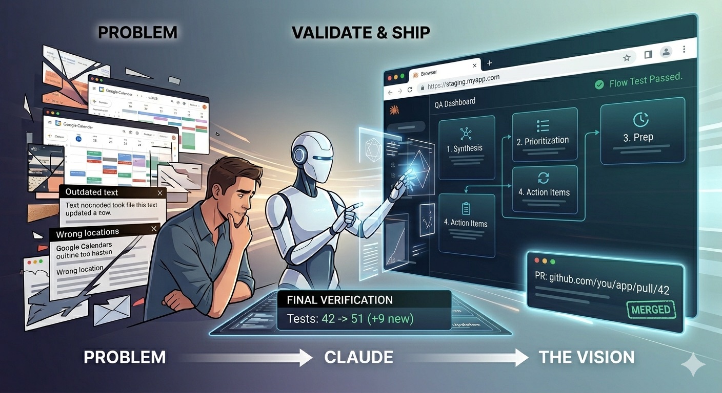 图 1:从混乱到清晰。用户(左侧)面对着多个杂乱的日历和错误的信息,感到非常沮丧。AI(Claude,中央)不仅倾听,而且主动介入,将这些碎片化的痛点合成为一个清晰的“私人幕僚长”愿景。右侧展示了重新构想后的五个核心功能模块:合成、优先级、背景准备、行动项和无缝更新。