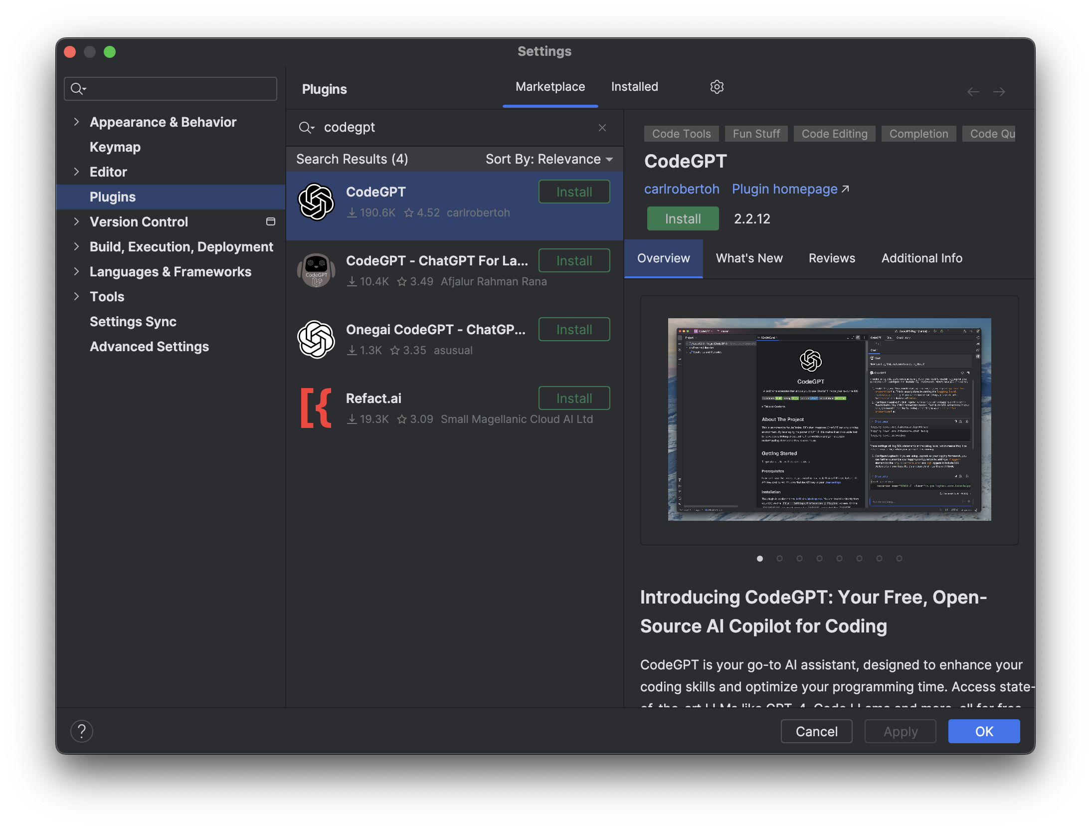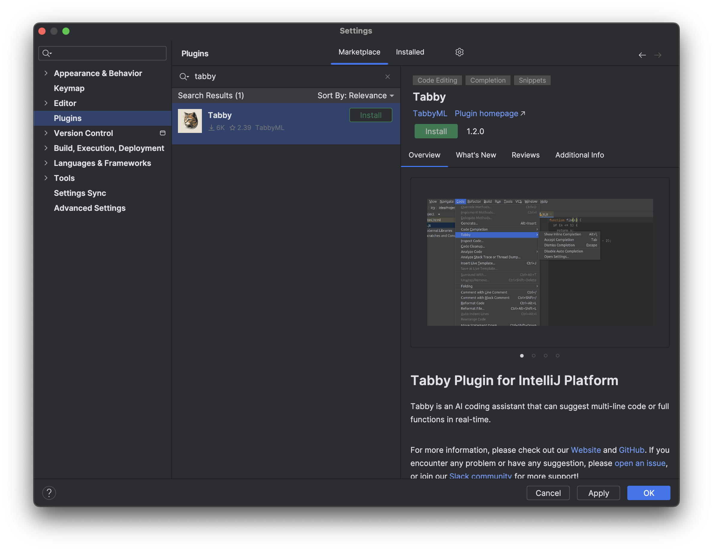 打开 IntelliJ IDEA,选择 Settings 菜单,选择 Plugins,搜索 Tabby 和 CodeGPT,点击 Install 安装。