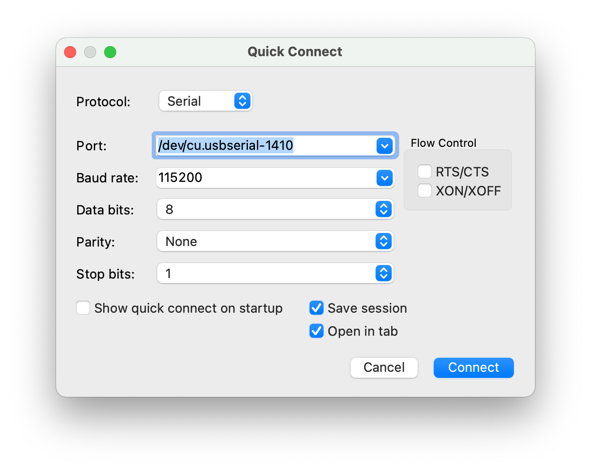 esptool.py --chip esp32 --port /dev/cu.usbserial-1410 --baud 460800 write_flash -z 0x1000 esp32-idf3-20210202-v1.14.bin
