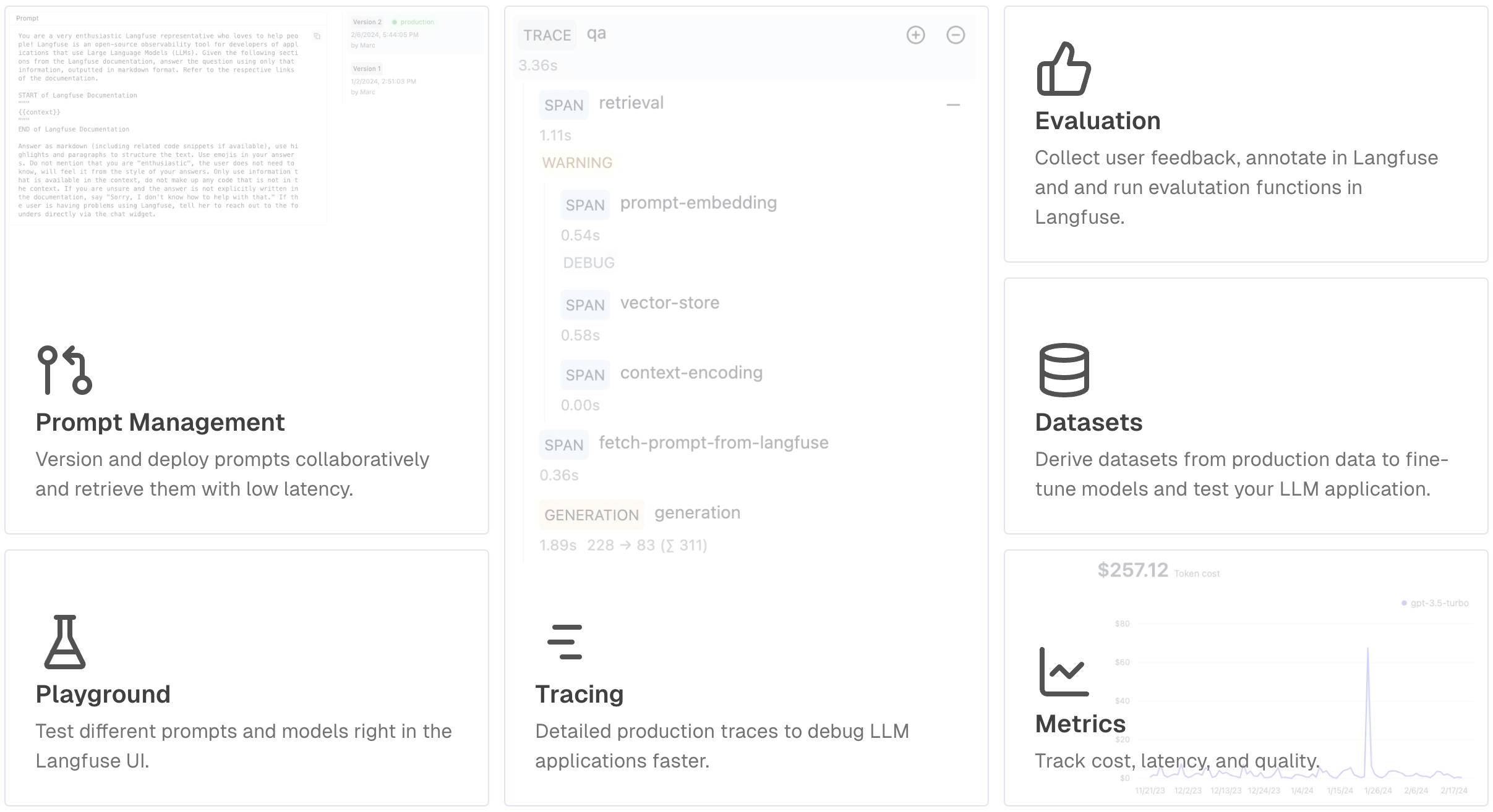 LLM 可观察性(LLM Observability)、提示管理(Prompt Management)、LLM 评估(LLM Evaluations)、数据集(Datasets)、LLM 指标(LLM Metrics)和提示游乐场(Prompt Playground)