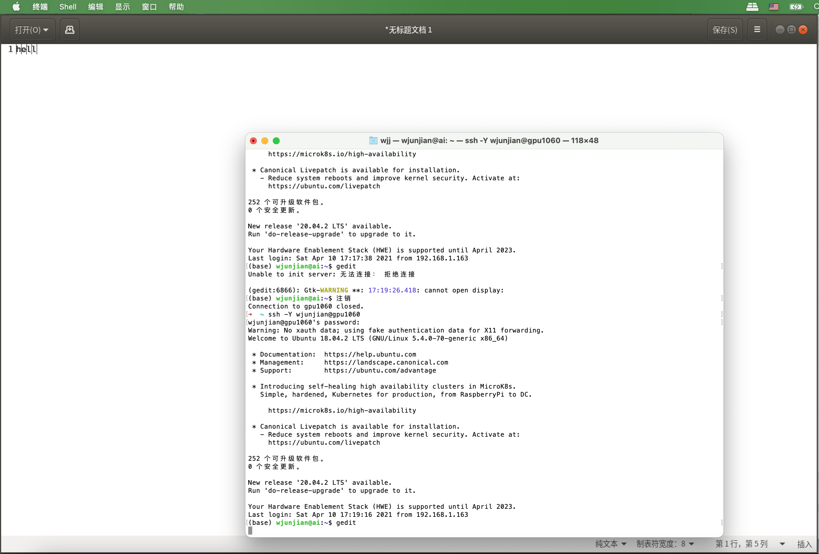 ssh -X -vv查看更多的失败信息。$ ssh -X username@hostname (base) username@hostname:~$ gedit