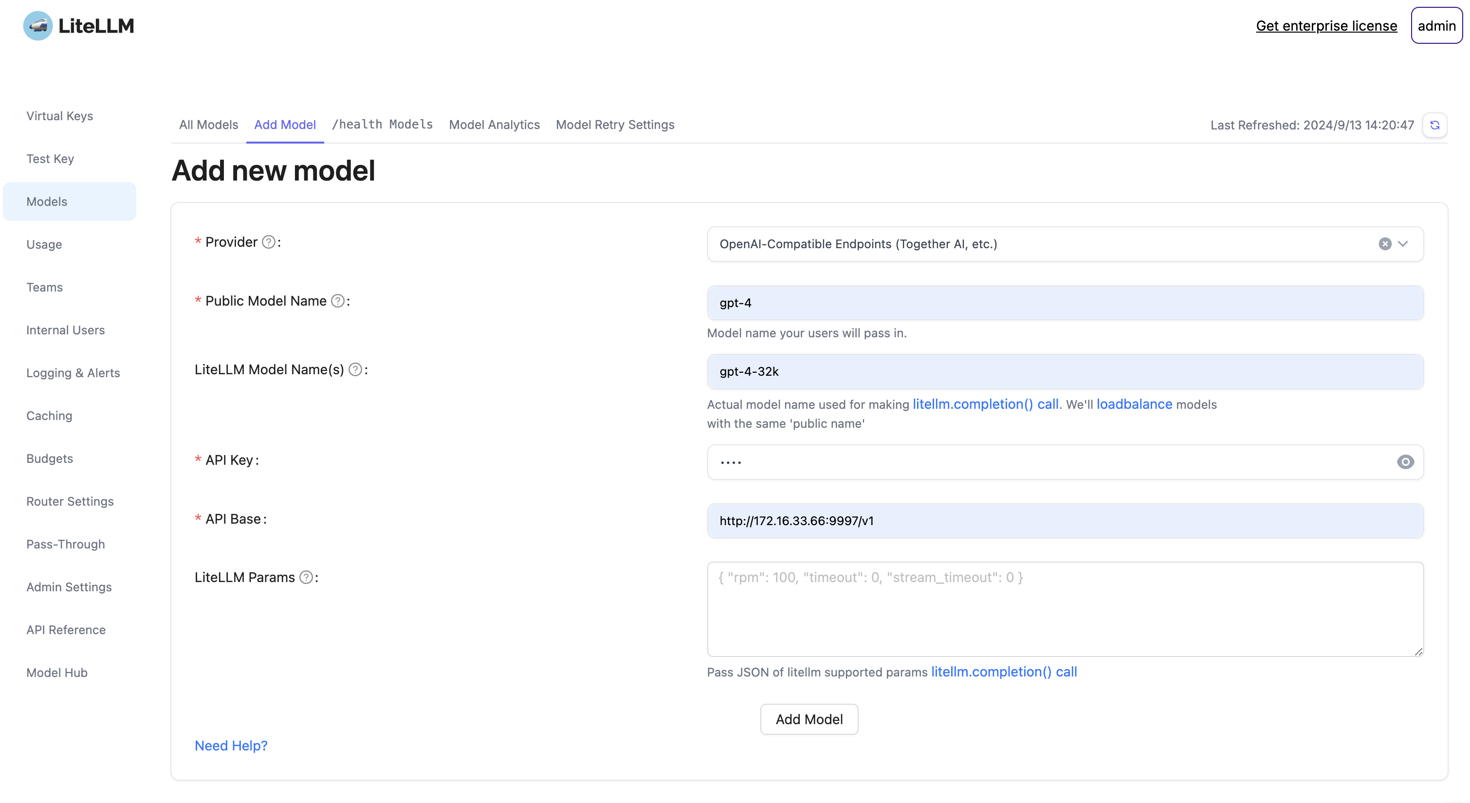 Provider: OpenAI-Compatible Endpoints (Together AI, etc.)Public Model Name: gpt-4LiteLLM Model Name(s): gpt-4-32kAPI Key: NONEAPI Base: http://172.16.33.66:9997/v1LiteLLM Params: Pass JSON of litellm supported params litellm.completion() call