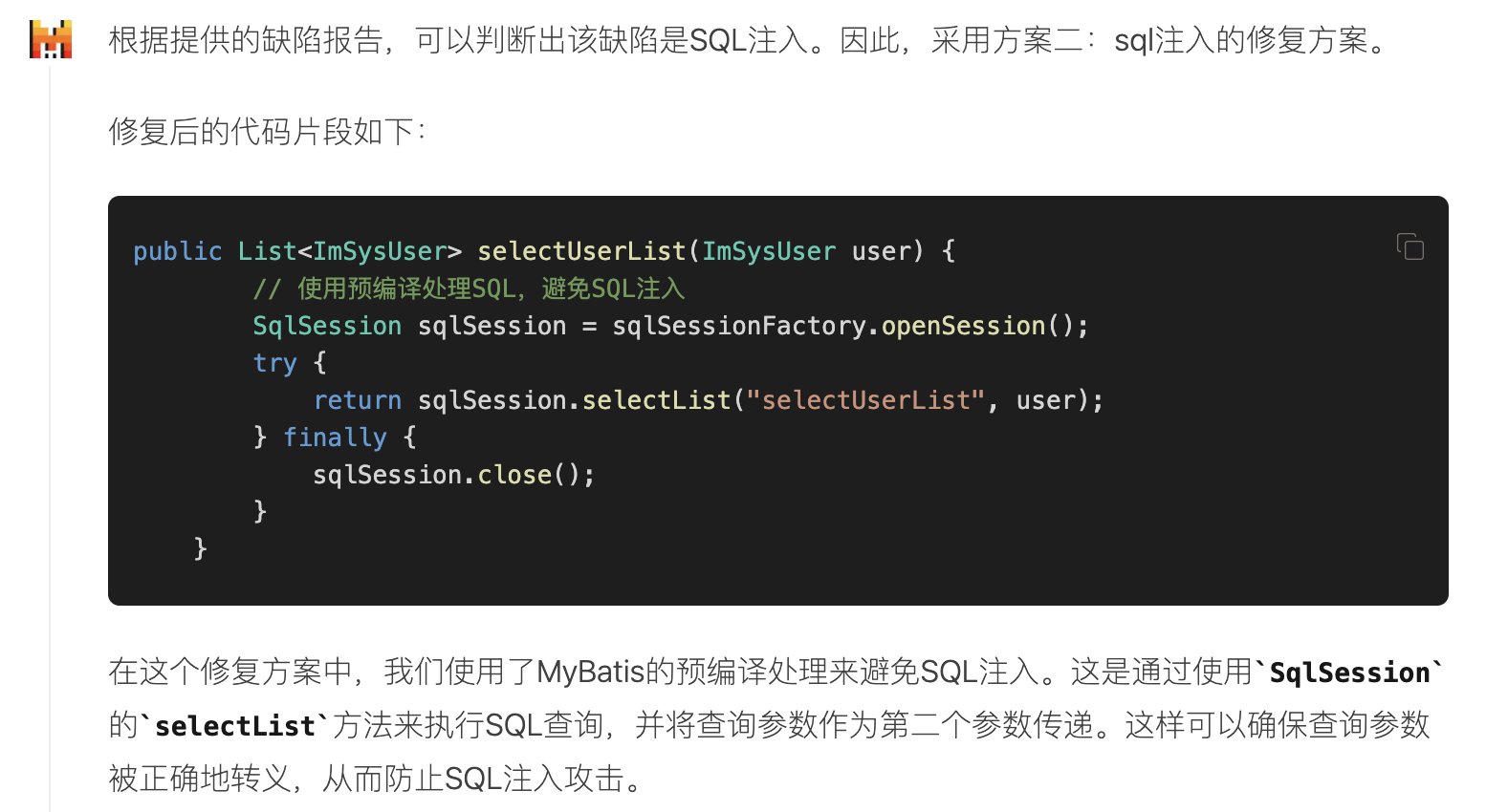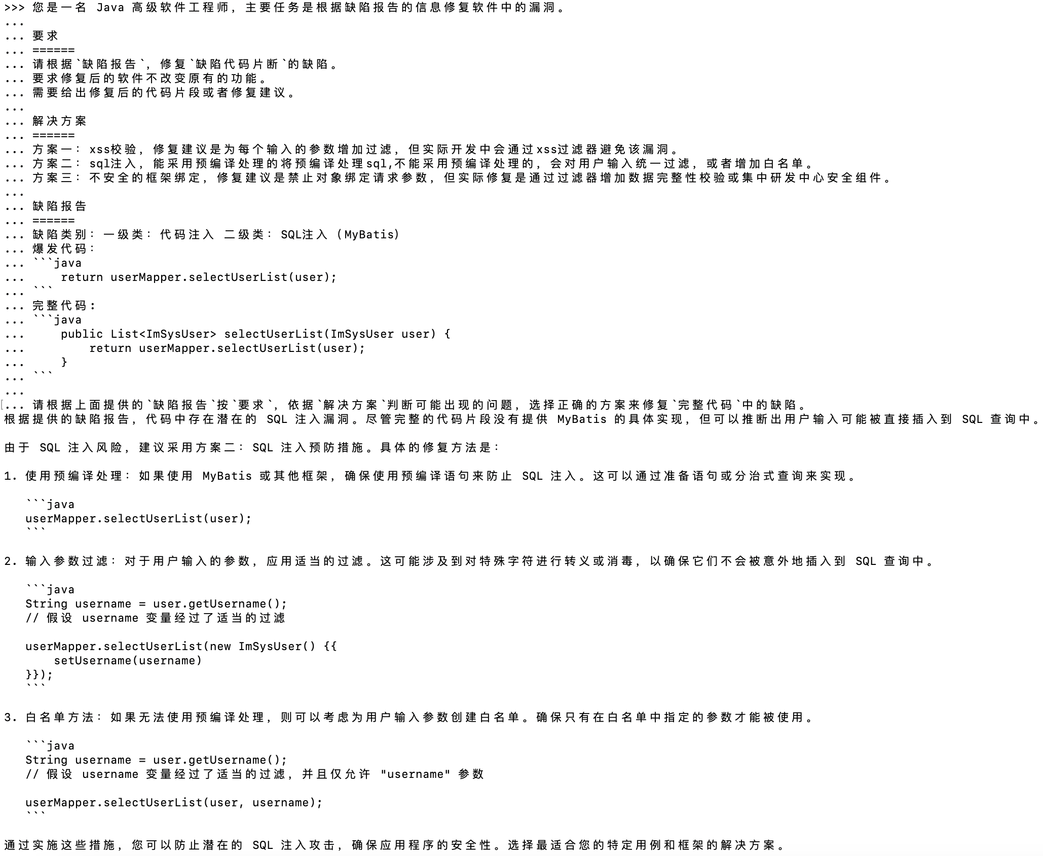 1. 修复后的Java调用代码: 由于我们更改了MyBatis Mapper XML中的SQL语句,Java调用代码不需要改变,因为MyBatis会自动处理参数化查询。