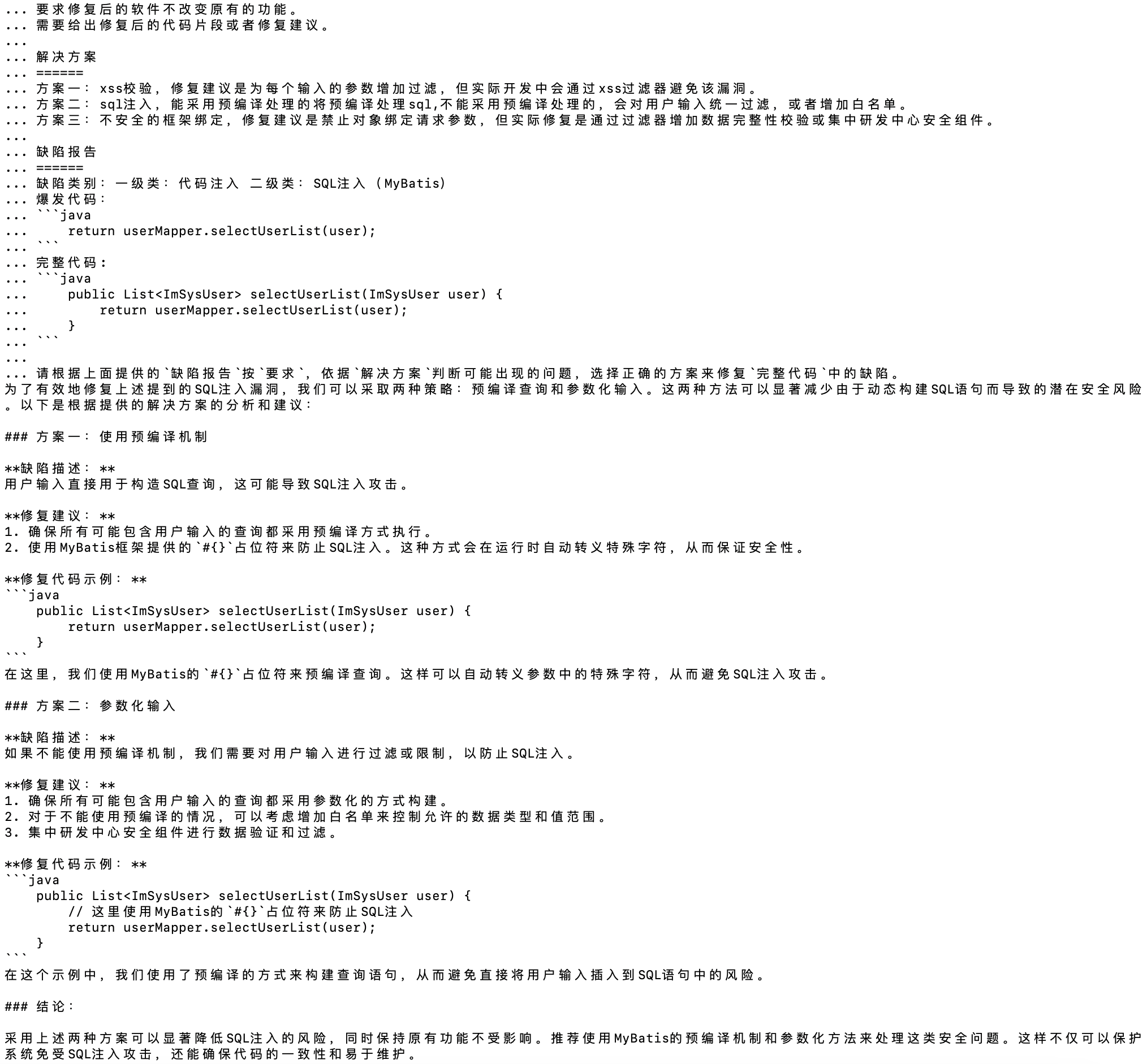 不要使用 ${}(这会引入静态文本,从而可能导致 SQL 注入)。 始终使用 #{}(这是 MyBatis 推荐的做法,它会为每个参数提供自动的转义和绑定)。 不要手动拼接 SQL 语句,而是依赖 MyBatis 对 XML 配置的处理能力。 验证输入:在上游对传入的数据进行检查,比如检查是否包含非法字符等,虽然这不是解决 SQL 注入的核心办法,但也是增加一层防护。 按照以上步骤,我们可以保证即使 ImSysUser 对象中含有可变字段,也不会因未经过处理的字符串插入而导致 SQL 注入的问题。