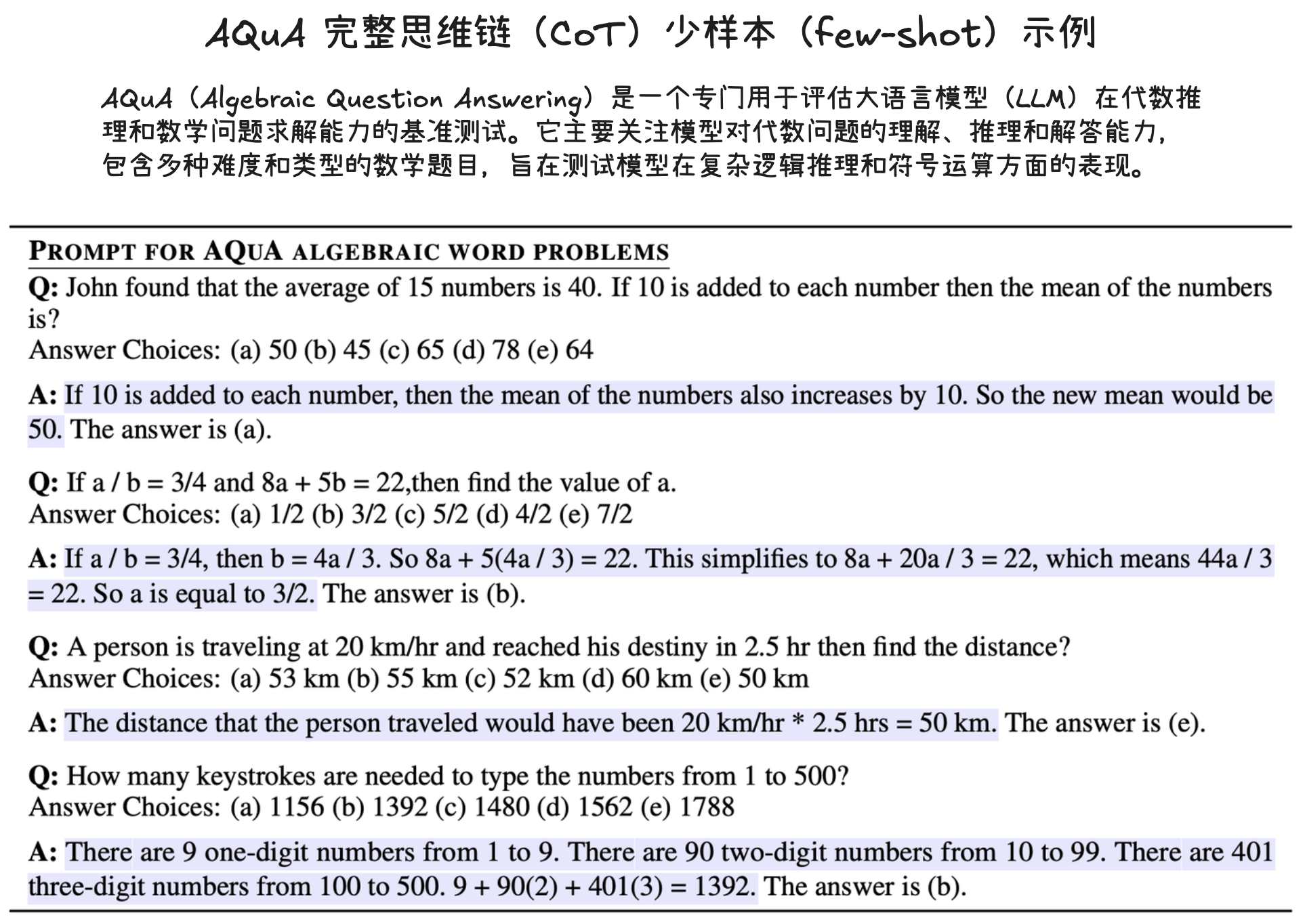 工作方式: 在向模型提问时,不仅仅是要求最终答案,而是在提示中包含一些示例,展示如何一步一步地思考并得出结论。例如,在解决一个数学应用题时,CoT 提示会展示解题的详细步骤,而不仅仅是最终的数字答案。