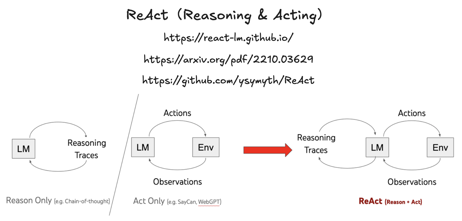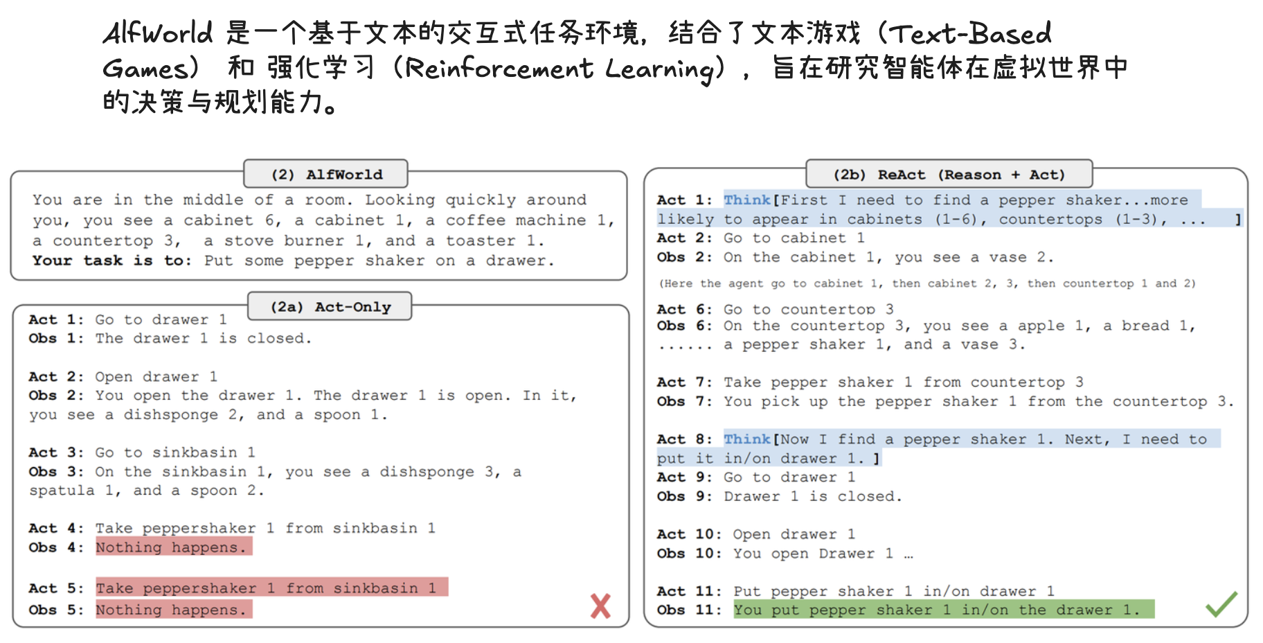 核心思想: ReAct 框架将“推理”(Reasoning)和“行动”(Acting)结合起来,让大型语言模型不仅能像 CoT 那样进行内部思考,还能与外部环境或工具进行交互以获取额外信息。