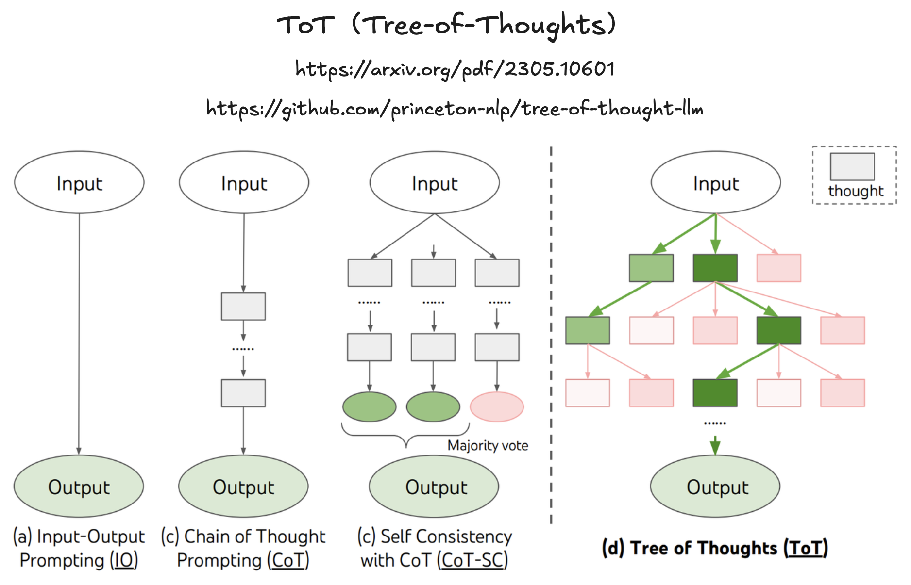 - ToT: 让模型同时“想”多种可能性,像树一样探索不同路径,并能评估和回溯。