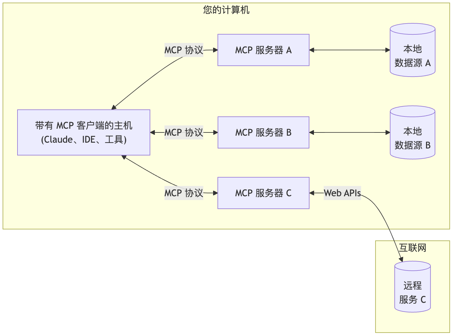 - 本地数据源:您的计算机的文件、数据库和服务,MCP 服务器可以安全地访问