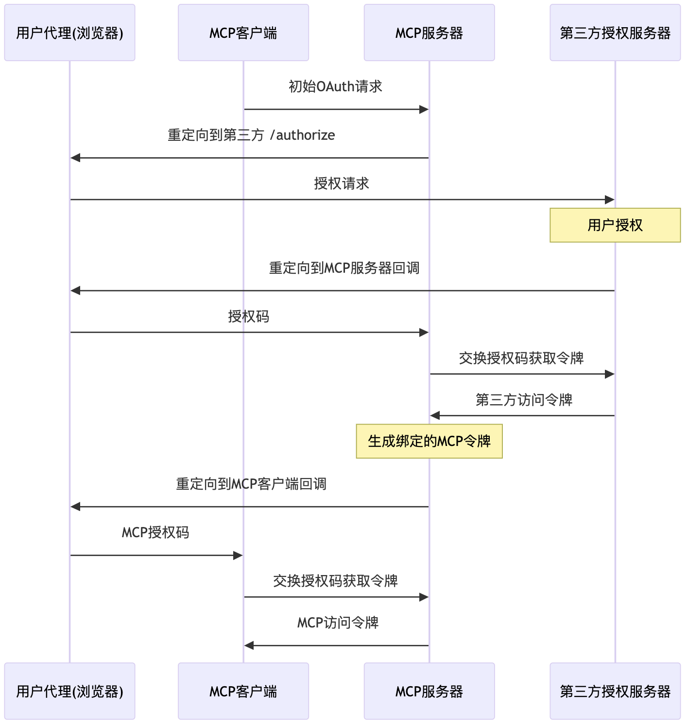MCP服务器可以通过第三方授权服务器支持委托授权。在此流程中,MCP服务器既是OAuth客户端(对第三方授权服务器),又是OAuth授权服务器(对MCP客户端)。