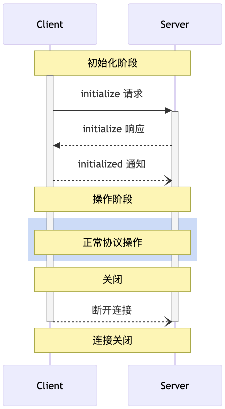 模型上下文协议 (MCP) 为客户端-服务器连接定义了严格的生命周期,确保适当的能力协商和状态管理。