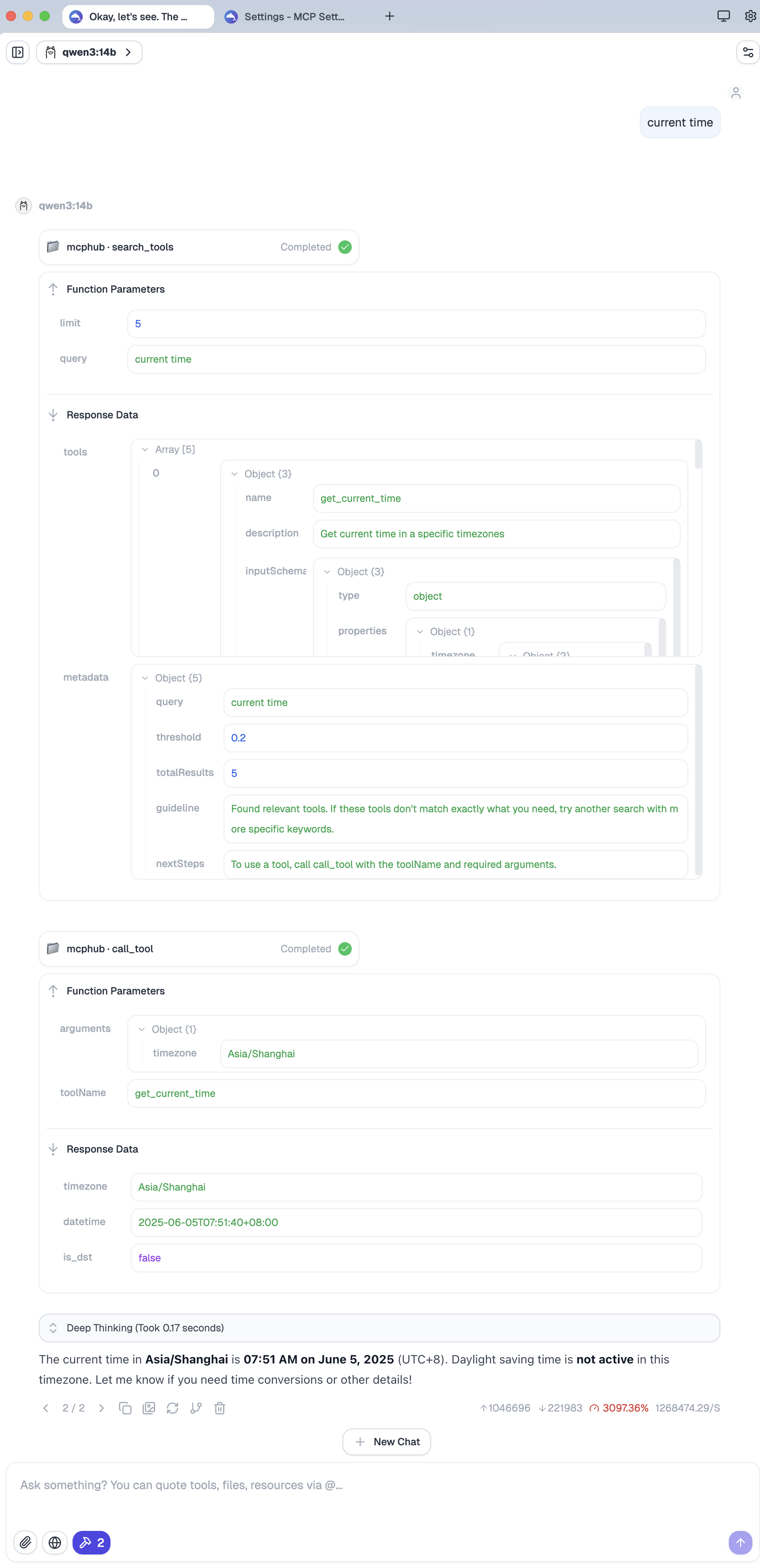 [16:10:42]info主 (29)Tool invocation result: {"content":[{"type":"text","text":"{\n \"timezone\": \"Asia/Shanghai\",\n \"datetime\": \"2025-06-05T16:10:42+08:00\",\n \"is_dst\": false\n}"}],"isError":false}