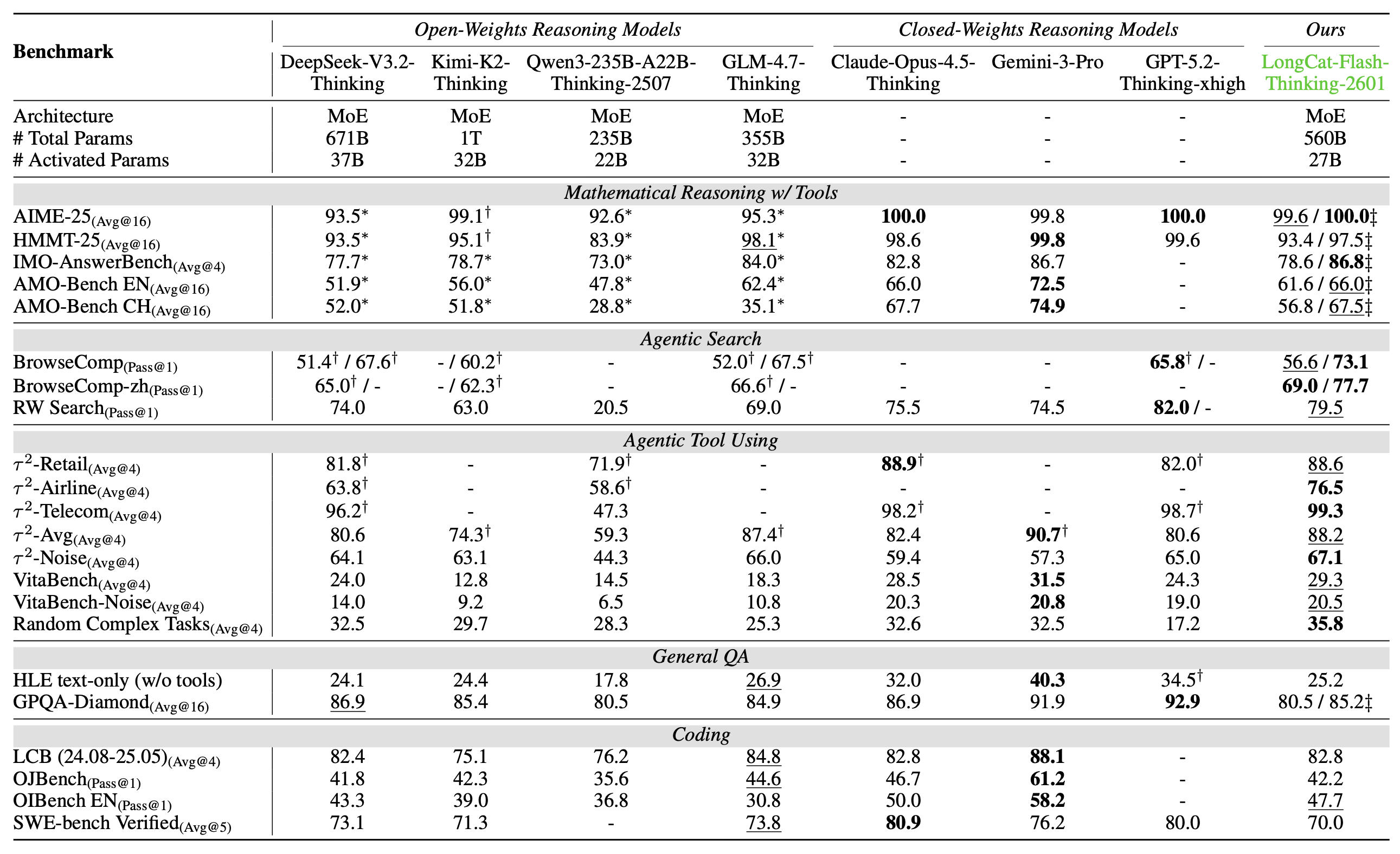 表格中对比了 LongCat-Flash-Thinking-2601 与主流开源推理模型(如 DeepSeek-V3.2、GLM-4.7 等)及闭源模型(如 GPT-5.2、Claude-4.5 等)在数学推理、智能体搜索、工具使用、通用问答和代码编程五个核心领域的性能表现。结果显示,该模型在智能体搜索和工具使用(Agentic Search & Tool Use)基准上表现卓越,在 BrowseComp、VitaBench 和随机复杂任务等多项测试中均位居开源模型首位,甚至在 RW Search 上表现仅次于 GPT-5.2。此外,在开启重思考模式(Heavy Thinking Mode)后,其数学推理(如 AIME-25 满分)和通用问答能力显著提升,达到了可比肩顶级闭源推理模型的第一梯队水平。