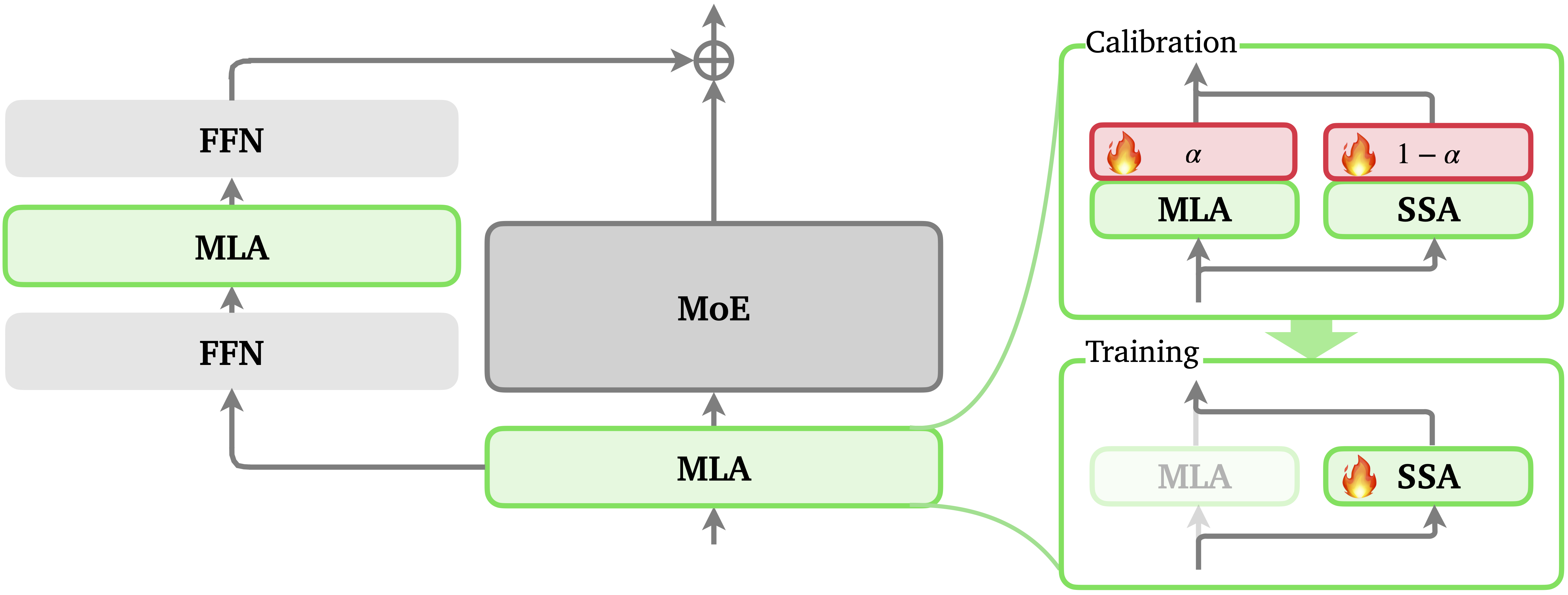 - 稀疏策略:它结合了多头潜变量注意力(MLA)与流式稀疏注意力(SSA),将每个查询标记(query token)的注意力限制在 局部窗口(近期标记)和全局锚点(序列开头的初始标记) 上。
