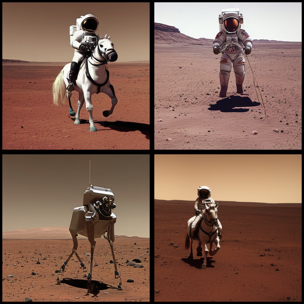 python txt2image.py "A photo of an astronaut riding a horse on Mars." --n_images 4 --n_rows 2