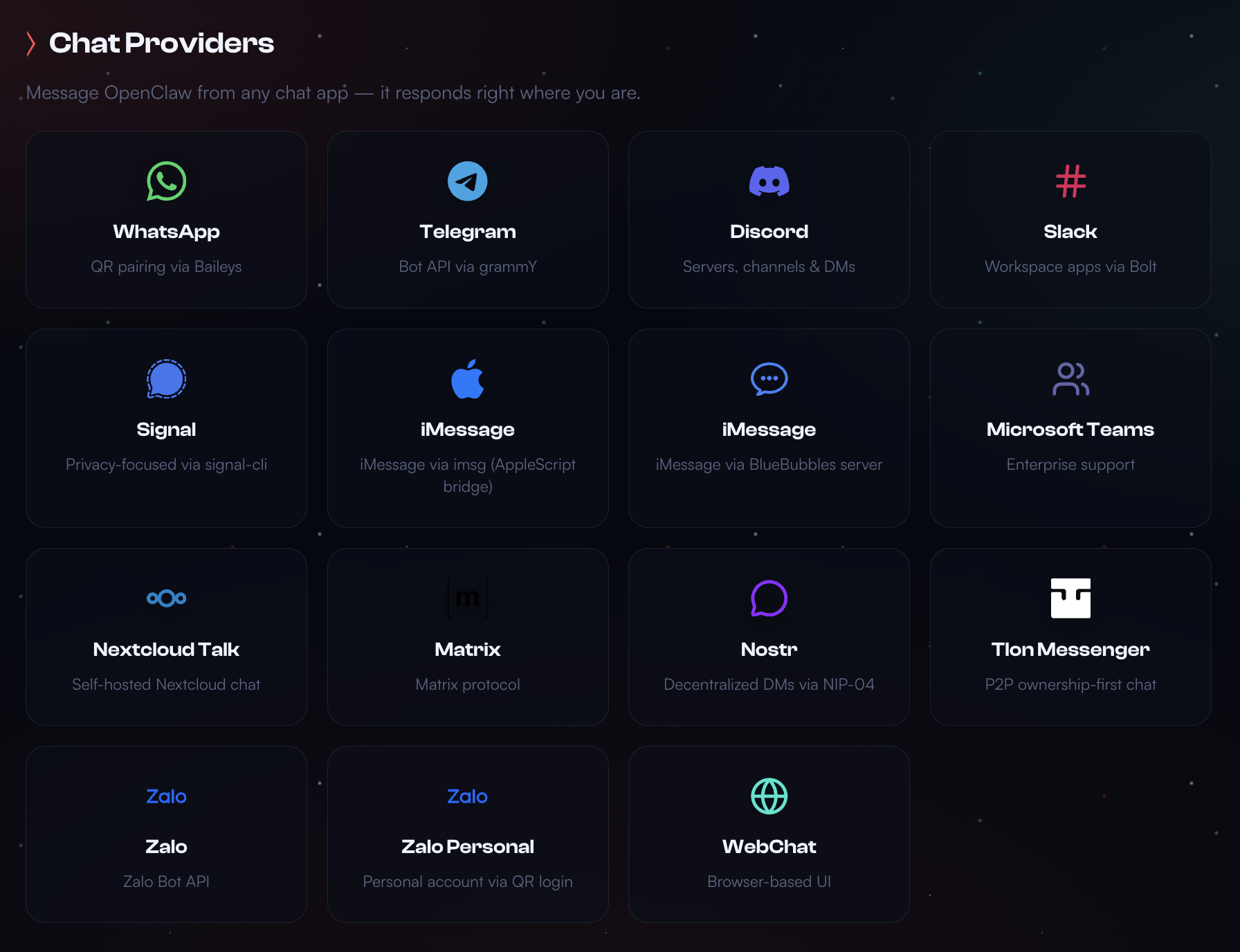 - 消息平台: 支持 WhatsApp, Telegram, Discord, 飞书等主流通讯软件,意味着用户可以在这些 App 里直接与 Agent 对话。