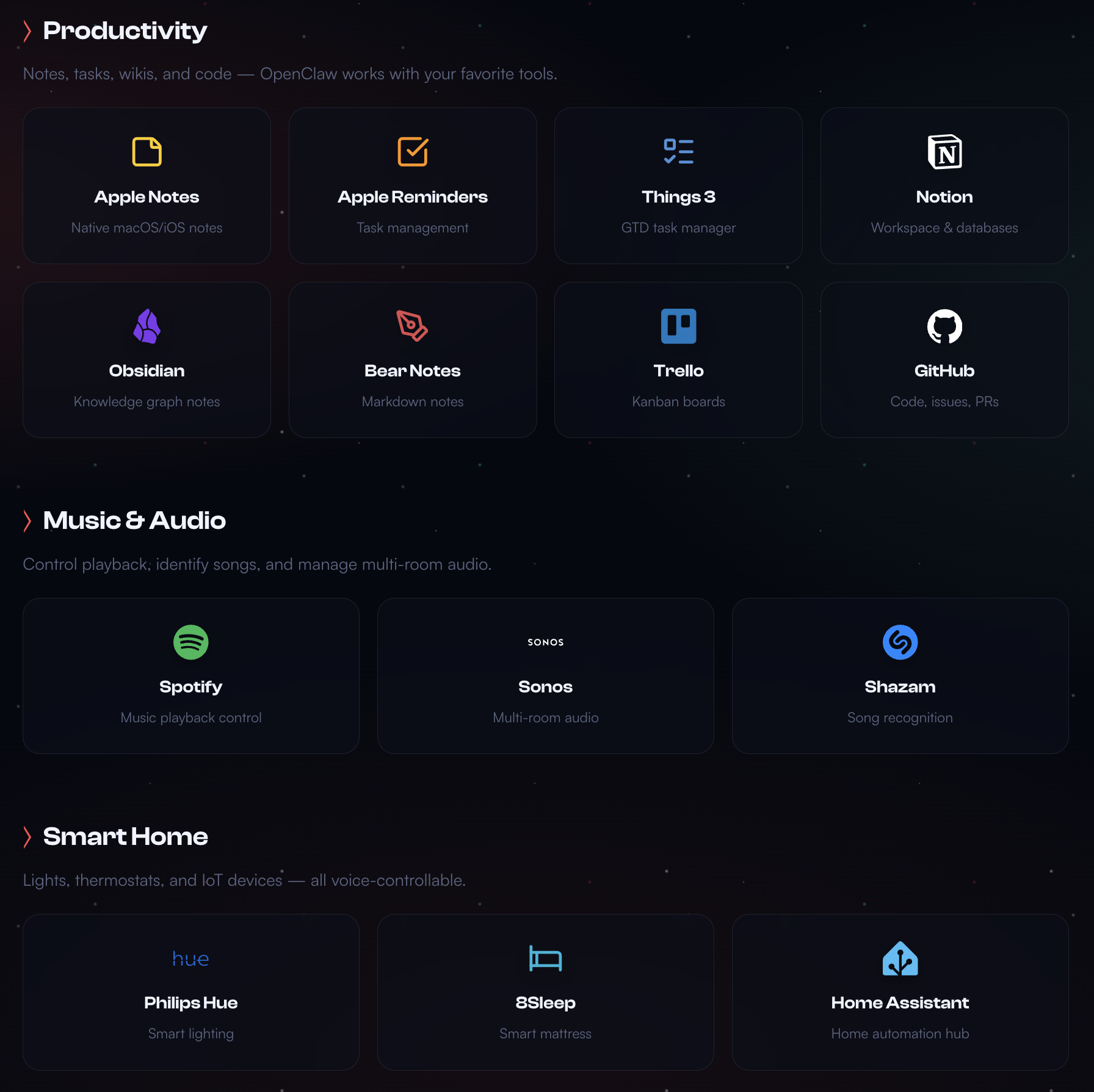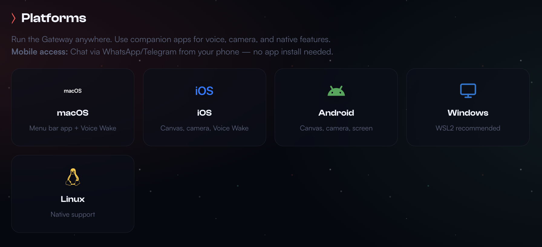 - 客户端节点 (Nodes): 覆盖 Android, iOS, macOS。这些节点不仅是聊天窗口,还能调用设备能力(如拍照、定位、录屏、执行脚本),让 AI 拥有“手”和“眼”。
