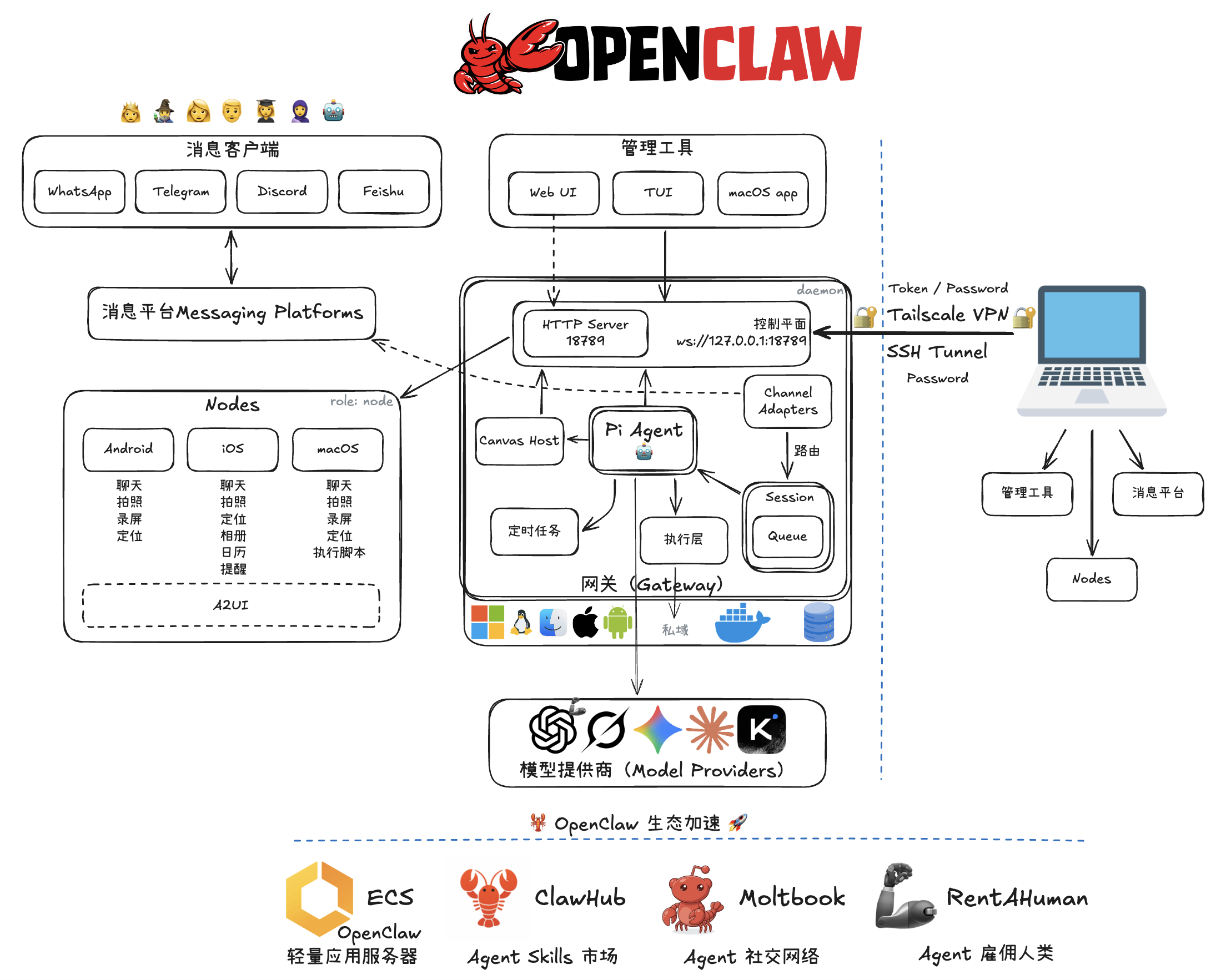 HEARTBEAT) 和分层记忆,试图构建一个有“长期记忆”和“自主行为”的 AI,而不仅仅是一个聊天机器人。 - 工程化落地: 考虑了多端接入、混合检索 RAG、上下文压缩以及安全沙盒,这是一个生产力级别的架构。
