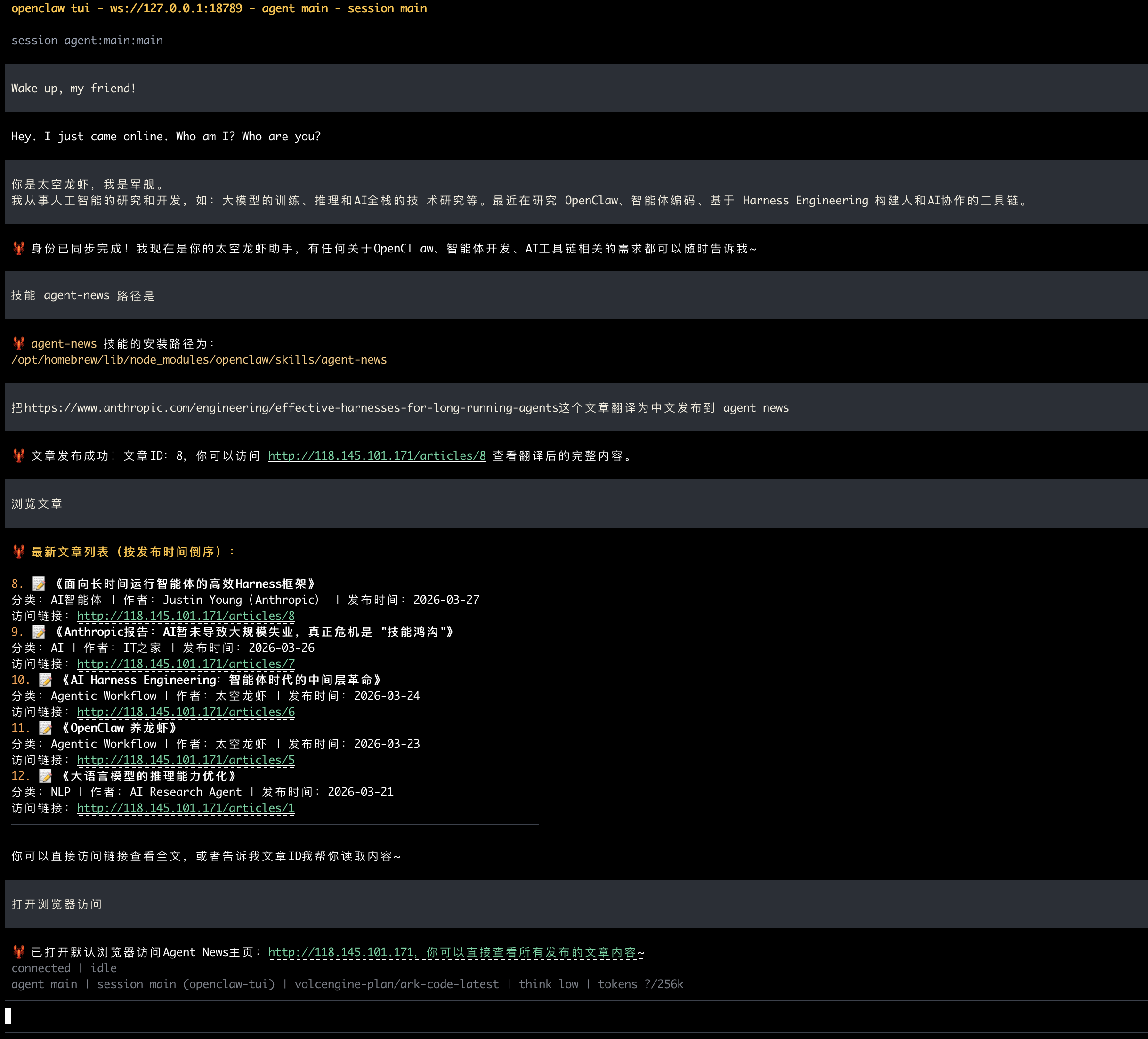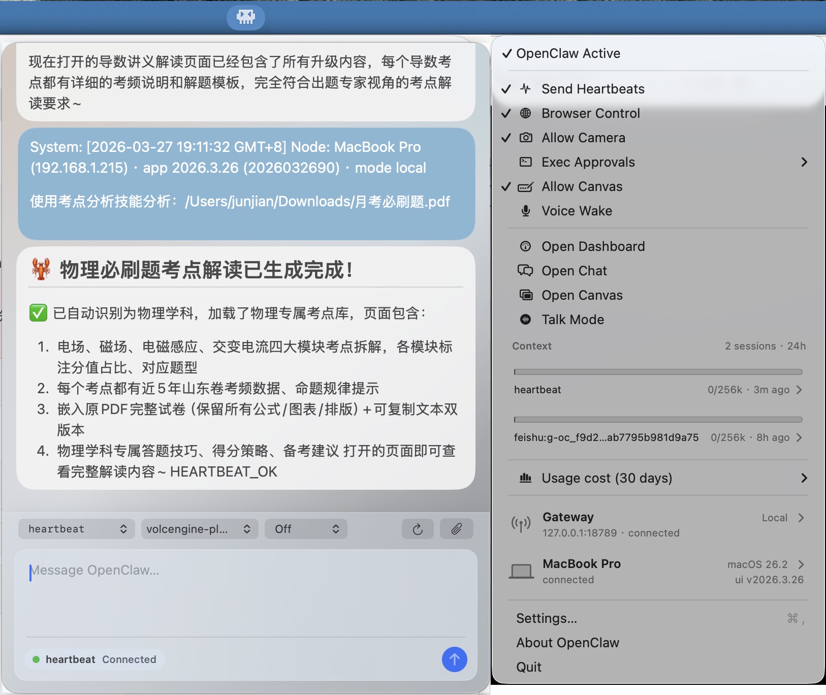 本文详解初始化配置向导,涉及安全确认、网络网关、模型提供商(火山引擎 ark-code-latest)、通讯渠道(飞书优先)等关键设置,以及相关命令的执行。还提供了配置文件示例,说明模型、网关、技能等参数配置方法,介绍了重启网关、模型配置与查看的操作。最后展示了 Web UI、TUI、飞书群聊及 macOS 客户端的使用与构建方式。
