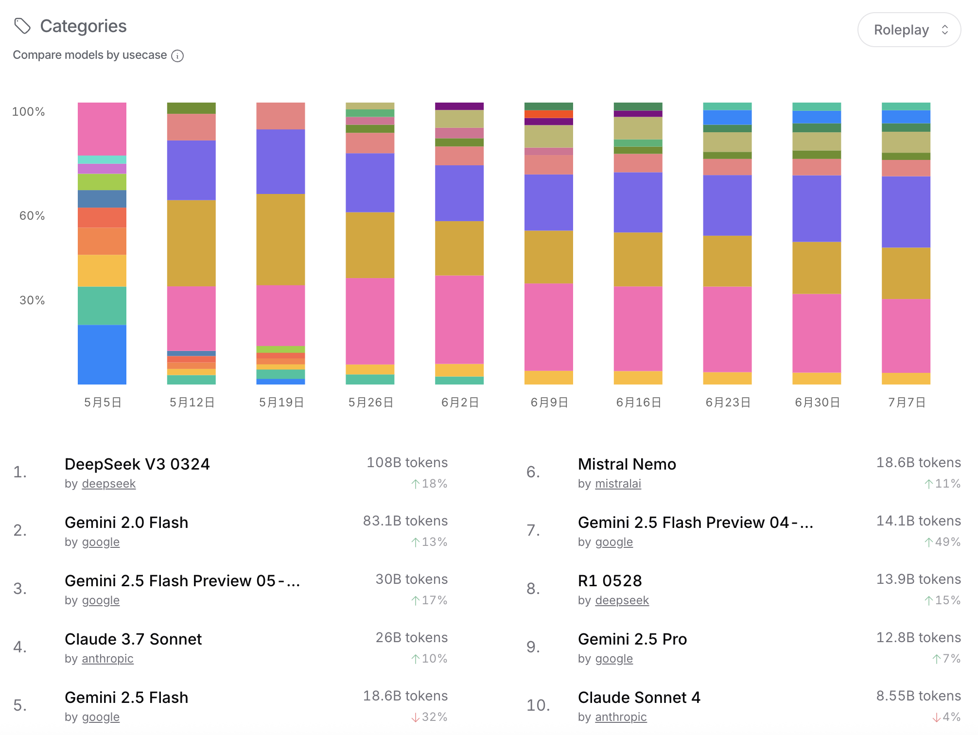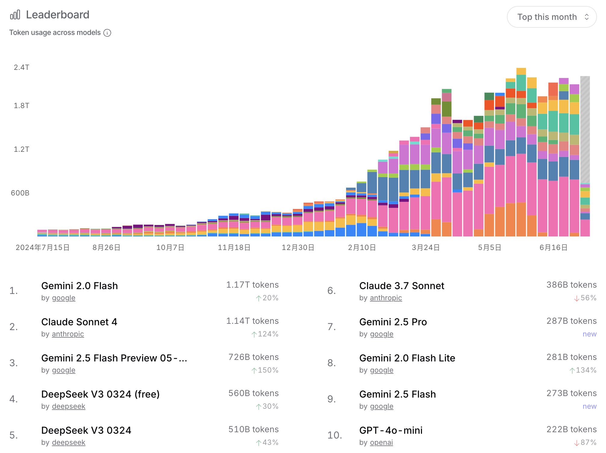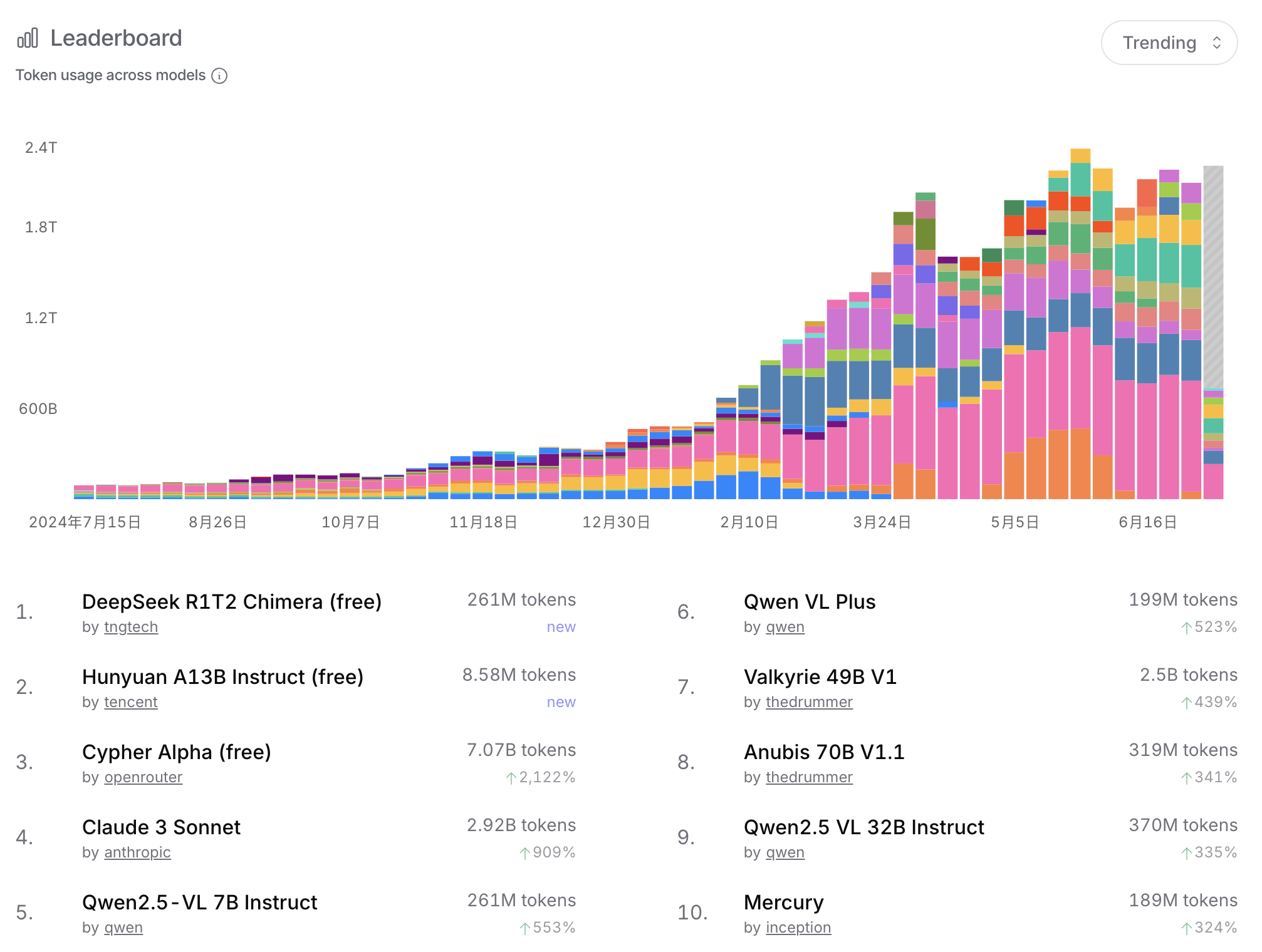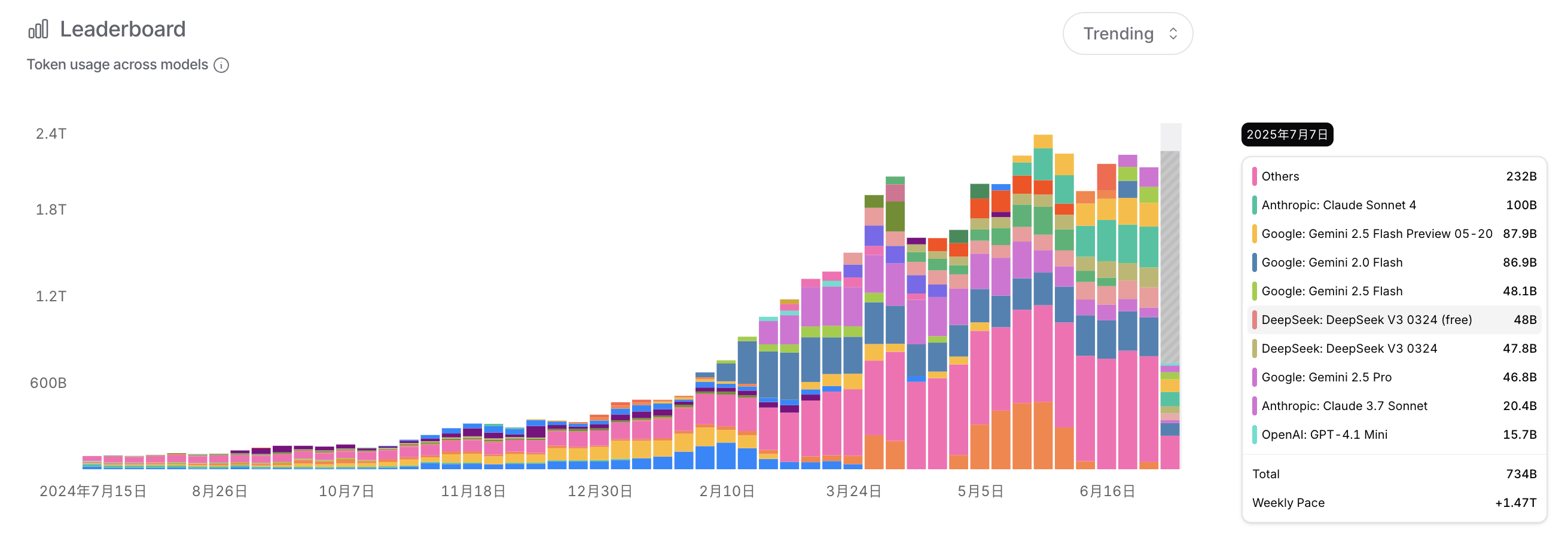 如果你还在纠结用哪个大模型,不妨看看OpenRouter的数据!截止到2025年7月7日,整个平台上的令牌使用量已经突破了2.4万亿(2.4T)!这说明AI应用场景真的是越来越广啦!