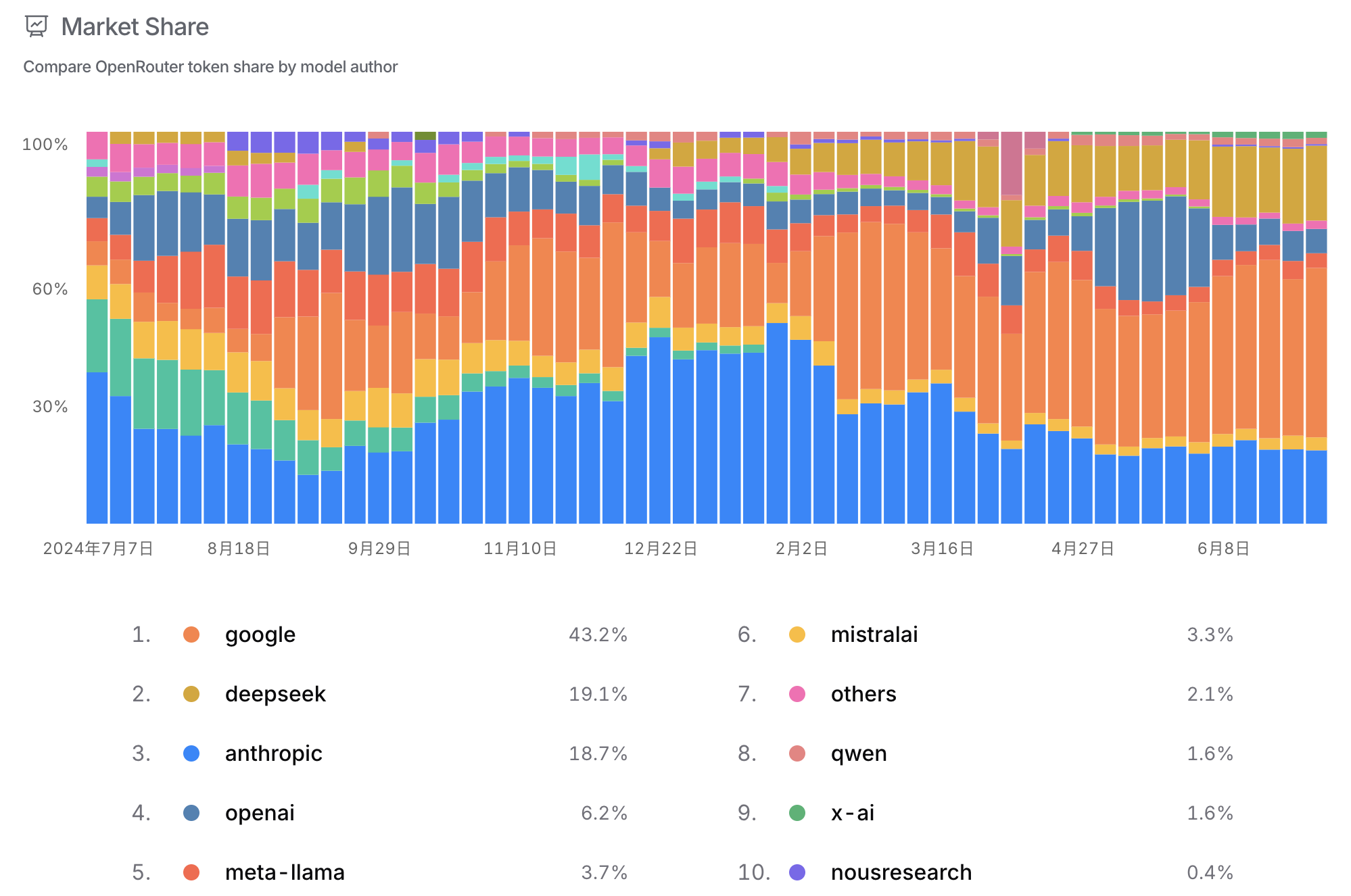而在这场“AI大混战”中,Google爸爸的Gemini系列模型绝对是遥遥领先,市场份额高达43.2%!几乎占据了半壁江山!其次是黑马Deepseek(19.1%)和我们熟悉的Anthropic(18.7%)。OpenAI虽然也榜上有名,但市场份额相对较小,只有6.2%。看来,大模型的竞争格局正在悄悄发生变化哦!