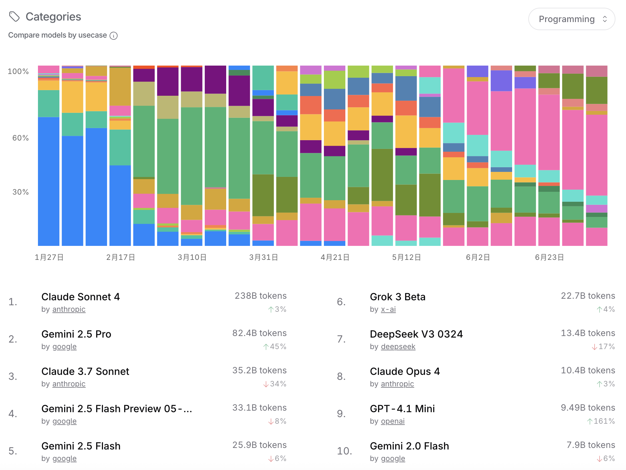 Grok 3 Beta: 虽然Grok 3 Beta的市场份额不如前面几位,但在特定应用场景下也展现出强大实力,比如在智能代理和内容生成方面。