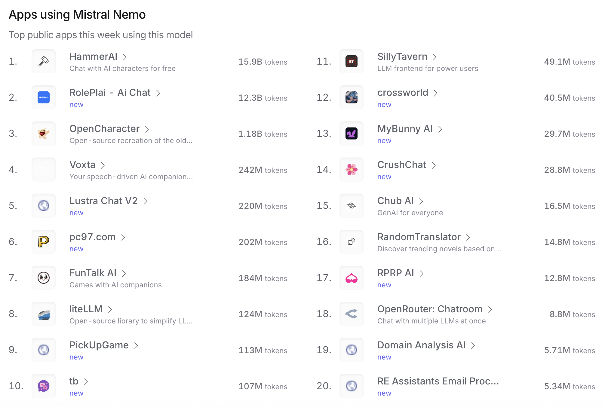Mistral Nemo: 如果你热爱AI角色扮演和创意写作,Mistral Nemo也值得关注。它在HammerAI和RolePlai Ai Chat等应用中非常受欢迎。