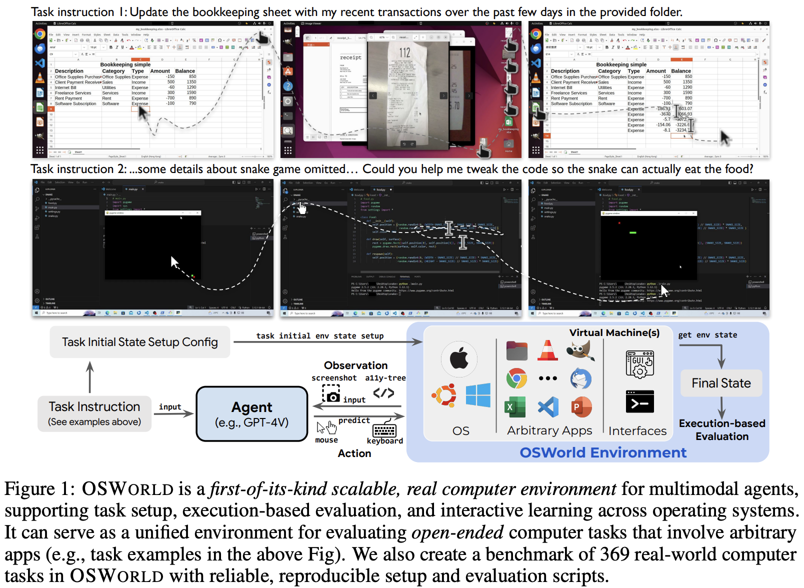 图1:OSWORLD是第一个可扩展的真实计算机环境,用于多模态代理,支持任务设置、基于执行的评估和跨操作系统的交互式学习。它可以作为一个统一的环境,用于评估涉及任意应用程序的开放式计算机任务(例如,上图中的任务示例)。我们还在OSWORLD中创建了一个包含369个真实计算机任务的基准测试,具有可靠、可重现的设置和评估脚本。