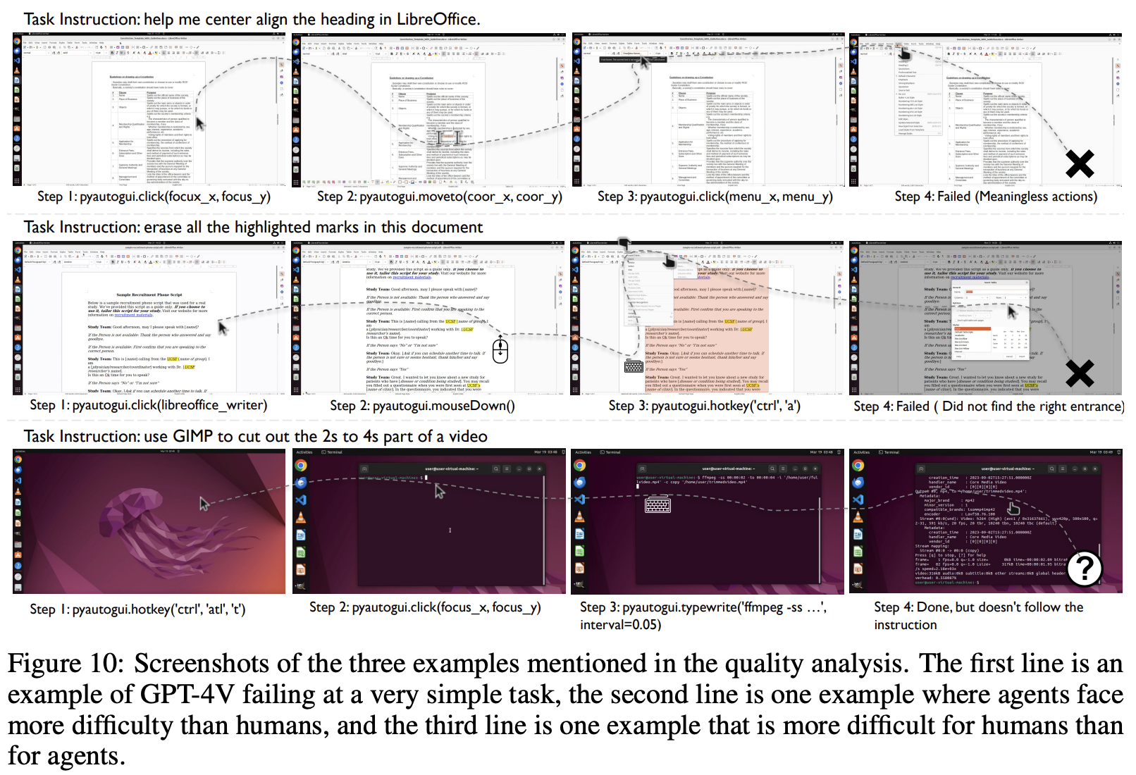 Success and failure cases We find agents, particularly based on GPT-4V, can successfully solve tasks that involve complex problem-solving or creative thinking, showcasing the advanced understanding and processing capabilities of the model already. One successful task is shown in the first row of Figure 9. The agent is requested to extract subtitle files from the video stream and save them locally. The agent first divides the screen into two parts, with the VLC application window on the left and the terminal window open on the right, and uses the ffmpeg command twice. The first use removes the subtitles embedded in the original video, and the second use saves the extracted subtitles locally.