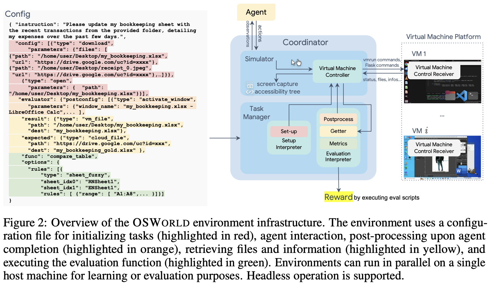 OSWORLD is an executable and controllable environment that supports task initialization, executionbased evaluation, and interactive agent learning in a range of real operating systems (e.g., Ubuntu, Windows, macOS) using virtual machine techniques, shown in the middle and right of Fig. 2. Virtual machine offers a safe isolated environment and prevents the agent resulting in irreversible damaging effect on the real host machine. The snapshot feature also enables efficient reset of the virtual environment. The environment is configured through a config file (shown in the left of Fig. 2) for interface initialization during the initialization phase (including downloading files, opening software, adjusting interface layout) (§2.2.2, highlighted with red in Fig. 2), post-processing during the evaluation phase (activating certain windows, saving some files for easy retrieval of information, highlighted with orange), and acquiring files and information for evaluation (such as the final spreadsheet file for spreadsheet tasks, cookies for Chrome tasks, highlighted with yellow in Fig. 2), as well as the evaluation functions and parameters used (§2.2.3, highlighted with green in Fig. 2). See App. A.1 for more details.